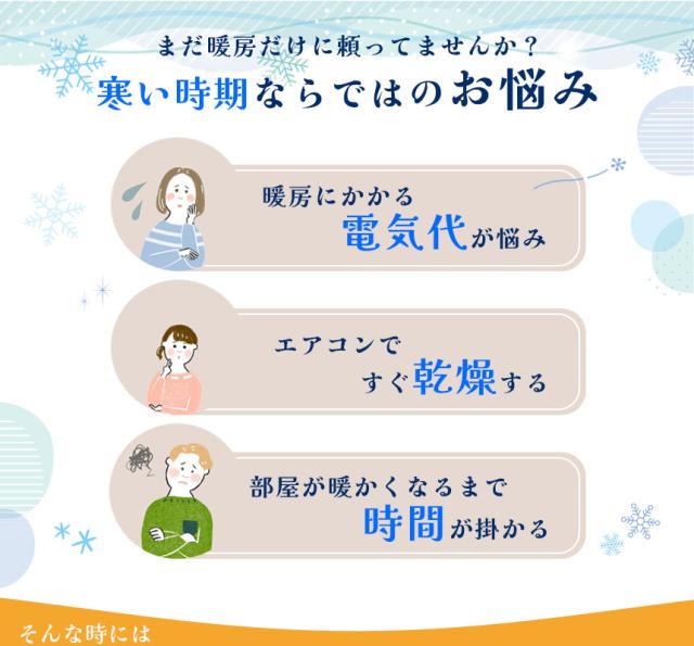 寒い時期でもスイッチを入れてすぐにぽかぽか。通勤前、デスクワーク、就寝前の冷え対策に最適です。