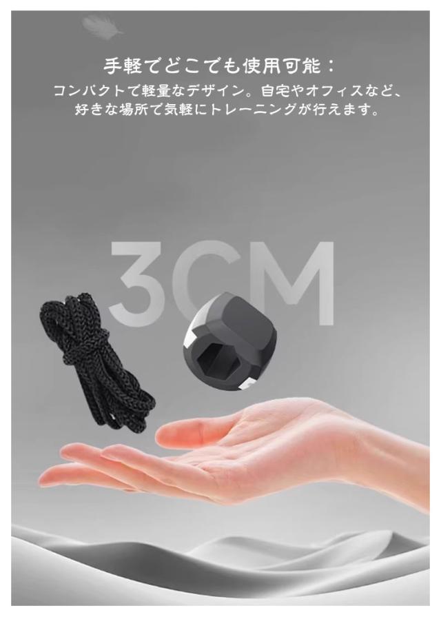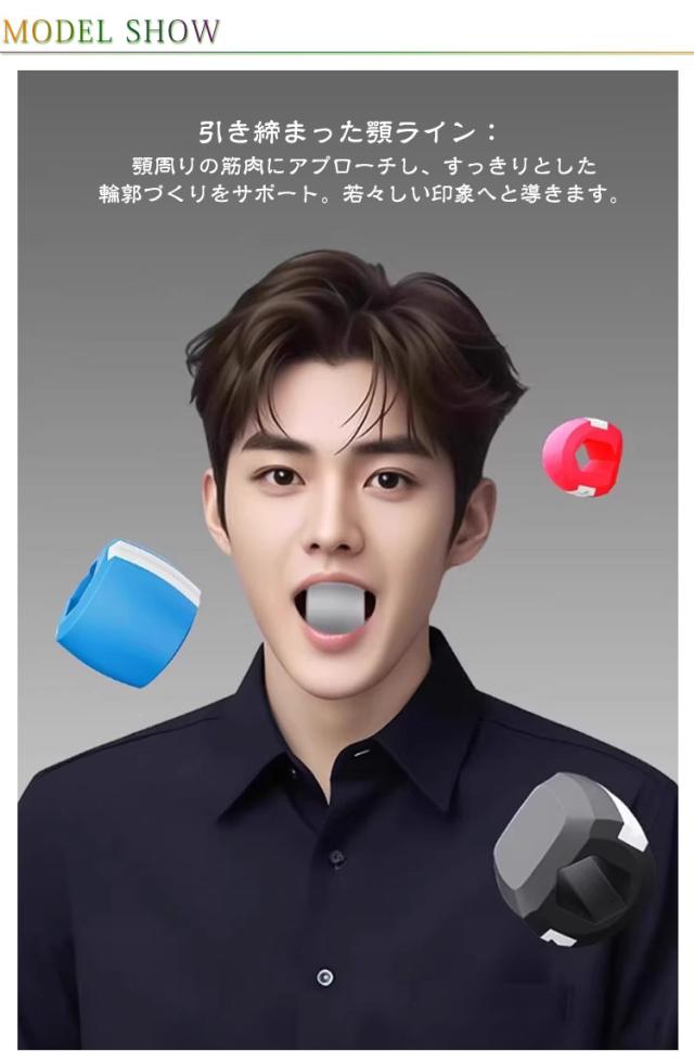 | 顎トレーニング 顔の表情を引き締め、口周りの表情筋を強化!! 引き締まった顎ライン: 顎周りの筋肉にアプローチし、すっきりとした輪郭づくりをサポート。若々しい印象へと導きます。 食品級シリコン素材: 口に入れても安心な食品級シリコン製。耐久性・耐熱性に優れ、清潔な使用を保ちます。 手軽でどこでも使用可能: コンパクトで軽量なデザイン。自宅やオフィスなど、好きな場所で気軽にトレーニングが行えます。 シンプルな使い方: 口に入れて一定のリズムで噛むだけ。簡単な動作で効率的に表情筋を活性化させます。 | |