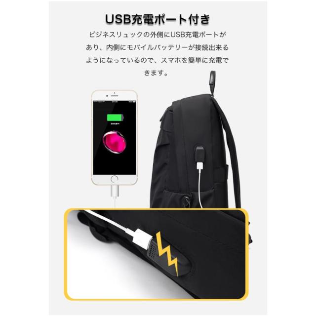 ビジネスリュックの外側にUSB充電ポートがあり、内側にモバイルバッテリーが接続出来るようになっているので、スマホを簡単に充電できます。