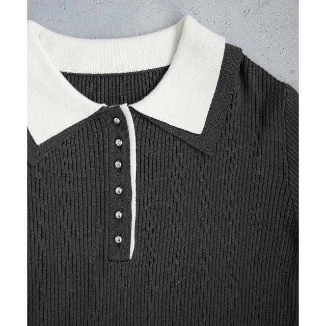 トレンドのダブルカラーデザインのポロニットトップス。女性らしくスマートなシルエットで拘りました。