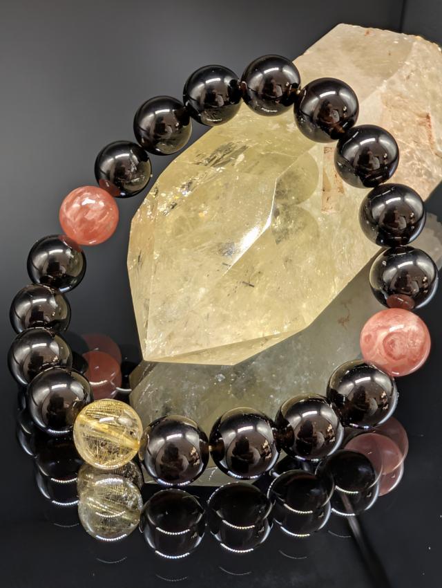 モリオンの高い守護効果で持ち主の安全性を守り、悪縁を切り、インカローズでプラスの波動、御縁を繋ぐような組み合わせとなっています