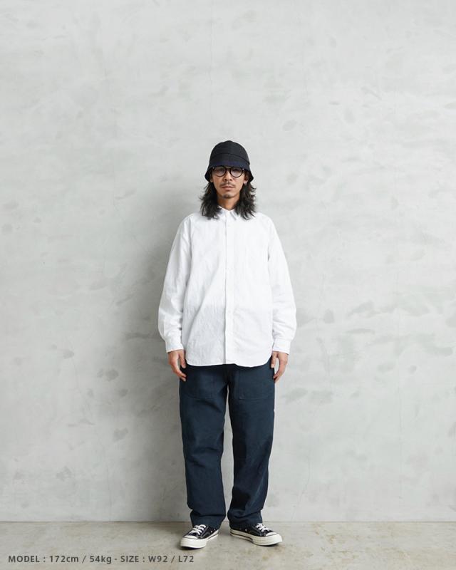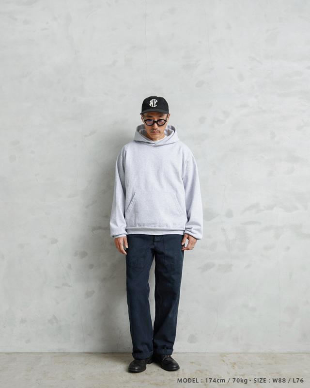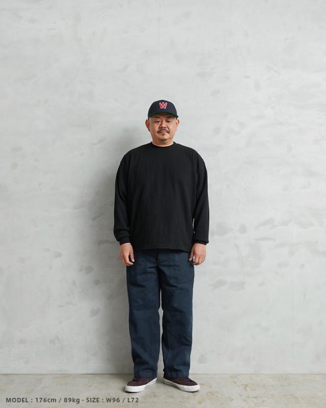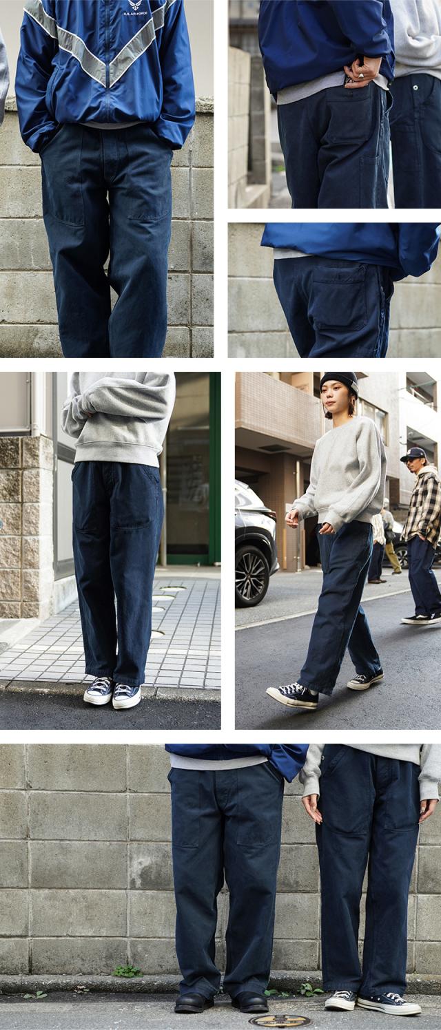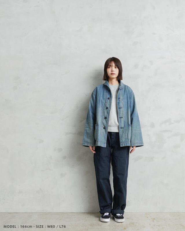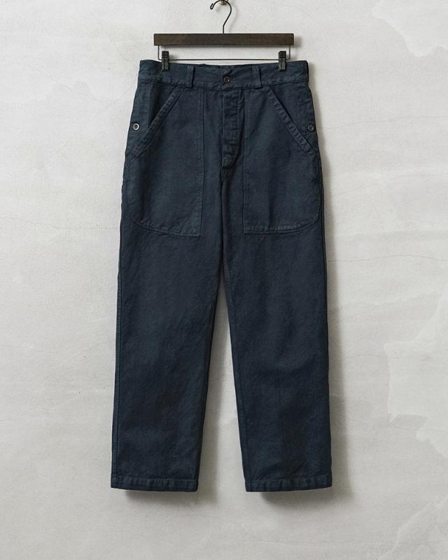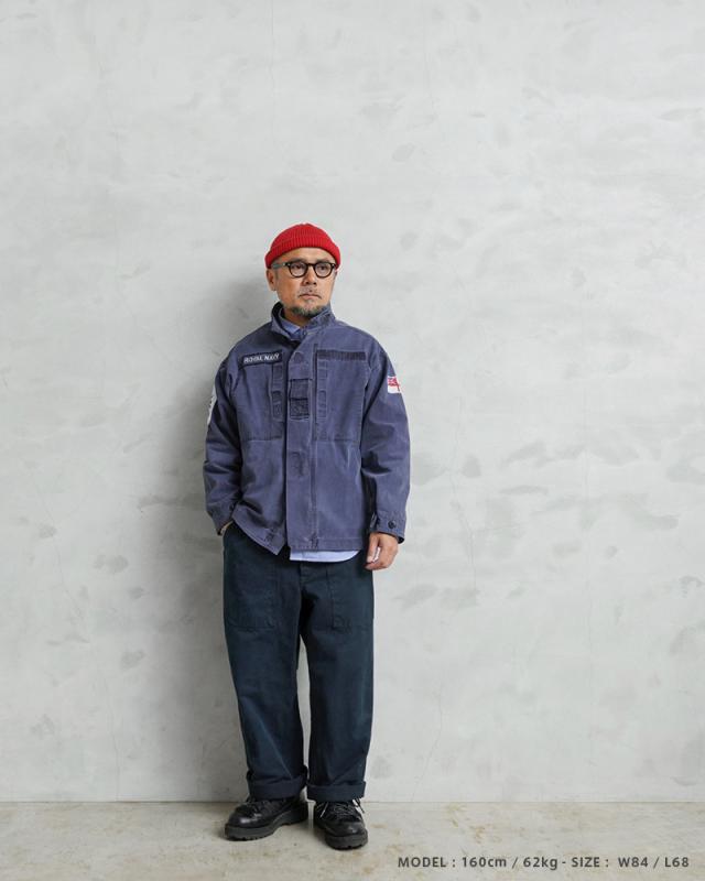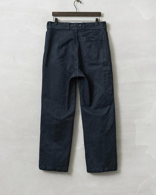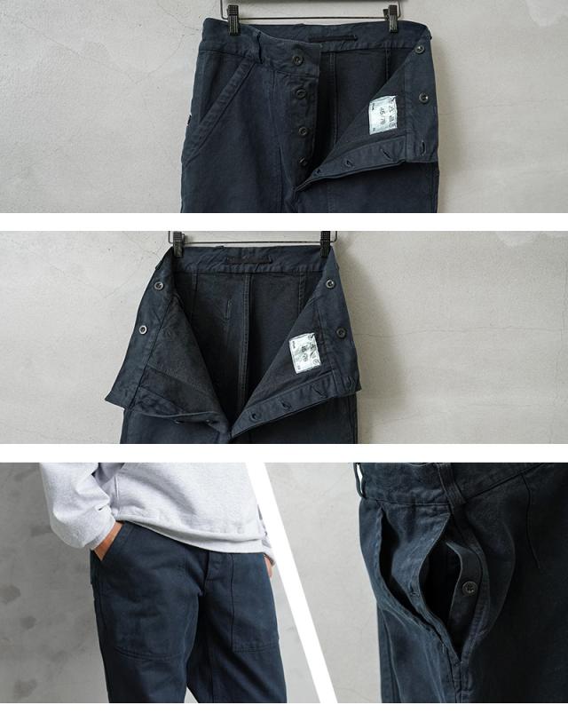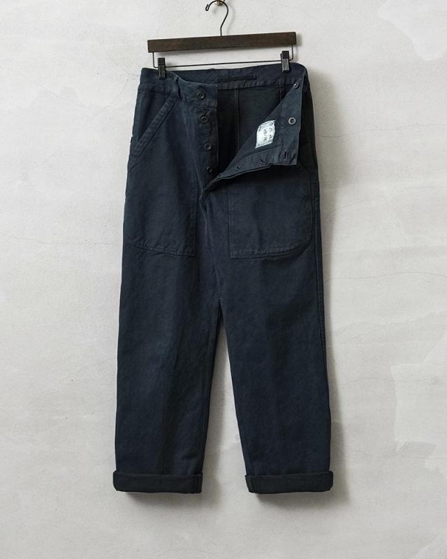 スイス軍のデニム素材のユニフォームは30年代ごろから存在が確認されており、こちらのタイプは主に1980年代以降から採用されていたものになります。年代によってボタンに違いがあり、通称前期型と呼ばれたアルミボタンタイプのものに対し、こちらはプラスチック製の樹脂ボタンを採用した通称後期型となります。今回、この希少性が高いアイテムを国内で丁寧にNAVY染めを施しました。黒に近い締まり感がありつつ、重く見えないNAVY染めは本来のがっしりとした質感に、後染めの効果も加わり、非常に雰囲気のある仕上がりに。これからまた履き込むほどにアタリや色落ちが出て、経年変化が非常に楽しみなアイテムです。長い期間着用が続けられていたということで、タフな印象を裏付けるスイス軍を代表する一本。クラシカルなディテールに独特な色合い、ゆったりとした太もも周りから裾にかけてやや細くなるキレイなテーパードシルエットは、様々なコーデにマッチするアイテムです。