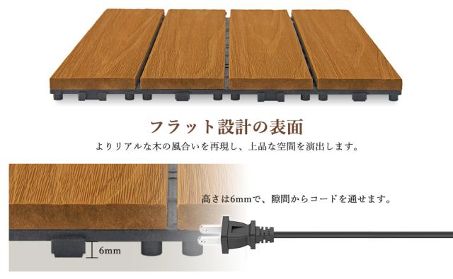 高い耐久性&耐候性 【高い耐久性&耐候性】 頻繁な摩擦や摩耗により、湿気や乾燥、温度変化などによる変形や曲がりが少なく、日常的な汚れの浸透性をさらに高め、メンテナンスの負担を大幅に軽減します。シロアリなどの害虫の心配もなく、めくれやひび割れも防ぎます。長期間使用しても、滑らかで美しい状態を保ちます。 【優れた安全性能】 有害なコーティング剤を一切使用していないため、有害物質への曝露による健康リスクの懸念がありません。天然木の木目と風合いを保ち、素足でも快適に過ごせ、冬も夏も暖かさを保ちます。安全性と実用性を両立したデザインです。 【簡単な組み立てと無料のDIY】 DIY初心者にとって非常に使いやすく、工具なしで簡単に組み立てられ、組み合わせ(異なるデザイン)または同じ色をつなぎ合わせることができ、さまざまなスタイルのニーズとスペースのサイズに応じて自由にカットでき、さまざまな形状のフロアマットに適しています。 【滑り止め】 表面はきめ細かな凹凸加工を施し、わずかに粗めに仕上げることで、絶妙なバランスのとれた質感を実現。木の自然な風合いを保ちながら、日常の歩行時に優れた滑り止め効果を発揮します。実用性、快適性、メンテナンスの容易さを兼ね備え、まさに優れた品質を体現しています。 【あらゆるシーンに最適】 玄関、中庭、バルコニー、屋外など、様々なシーンで活躍します。手間が省けるだけでなく、全体の調和のとれたスタイルを演出します。 |