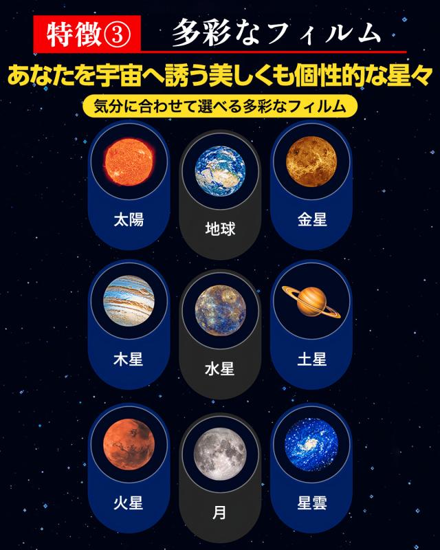 多彩な26種のフィルムセット:地球や月等の天体10種、クリスマス10種、ハロウィン6種を同梱し、一年中のイベントに対応します。