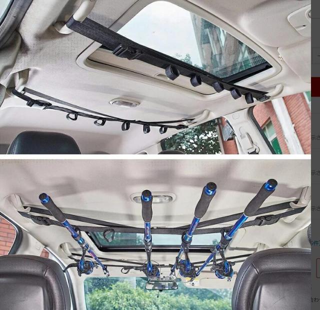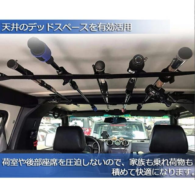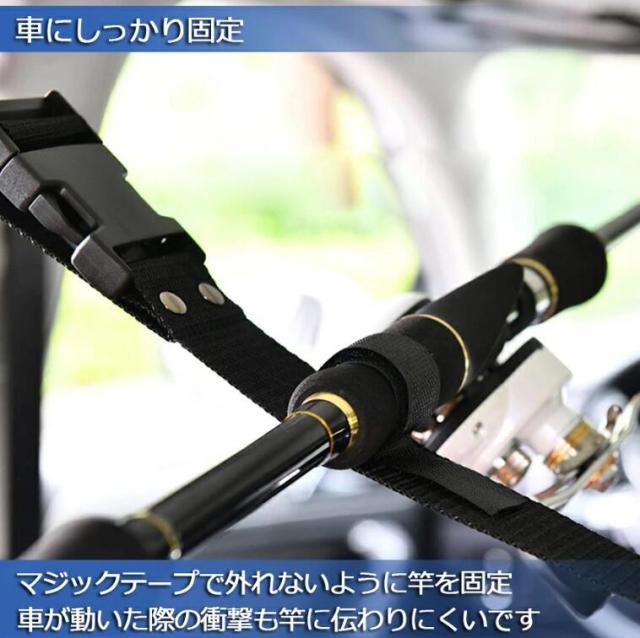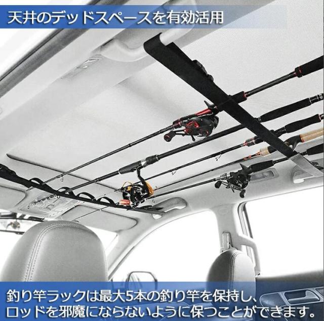 【 ロッドホルダーサイズ】最大釣り竿の搭載数:5本。釣り竿ラックは最大5本の釣り竿を保持し、ロッドを邪魔にならないように保つことができます。【 簡単に取付ける】車内の両サイドにあるつり革に通すだけで簡単に装着できるロッドホルダーです。取付部分はバックルになってますので取付・取り外しも簡単です。