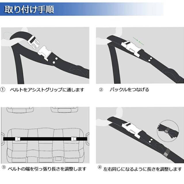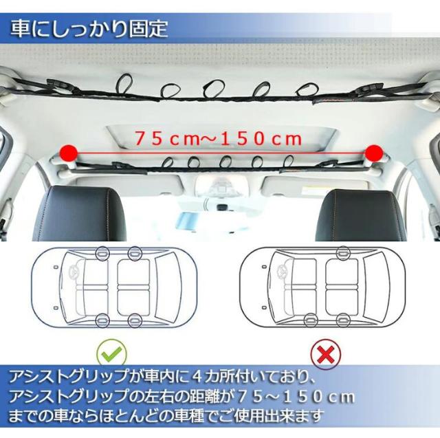 【注意事項】ご購入の前に車のアシストグリップ(手すり)間の幅が75cm〜150cmであることを確認してください。車種により前後の幅が違う場合があるため、前後両方のサイズ確認お願いいたします。ベルトの下がりを少なくするため、しっかり張った状態にしてください。