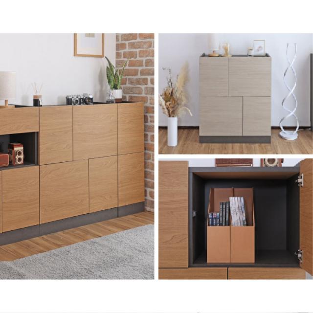 組み合わせ次第で、リビングボード・キャビネット・飾り棚など多用途に展開可能です。生活スタイルの変化や家族の成長に合わせてレイアウト変更ができ、長く使える設計です。