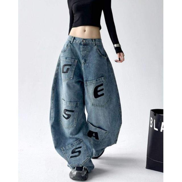 デニムパンツ ワイドパンツ 個性的 アルファベット 英字 ポケット レディース おしゃれ ユニーク 大きいサイズ ダボパン バギー Y2K ルーズ