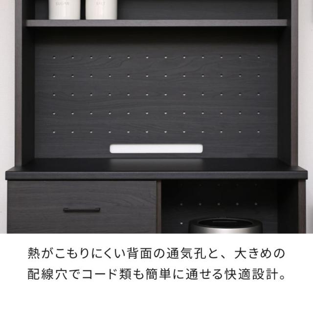 通気性を確保する通気孔+大きめの配線穴付き。蒸気や熱がこもりにくく家電使用時も快適。