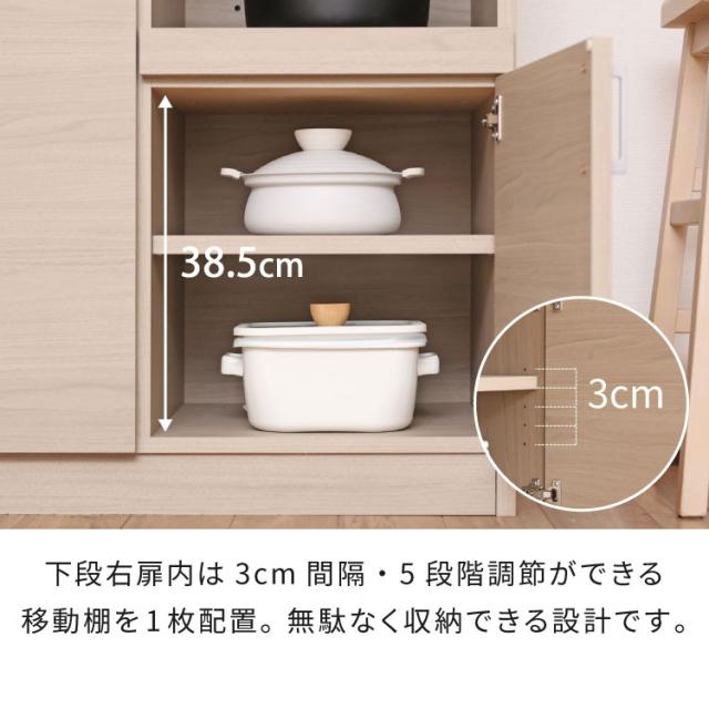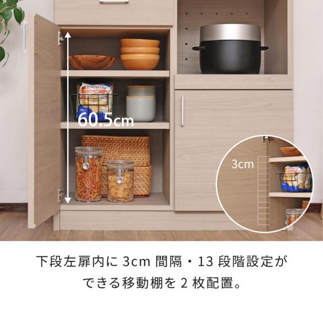 扉内には3cm間隔で高さ調整可能な移動棚を複数搭載。