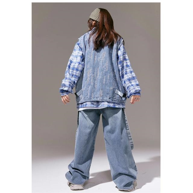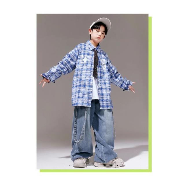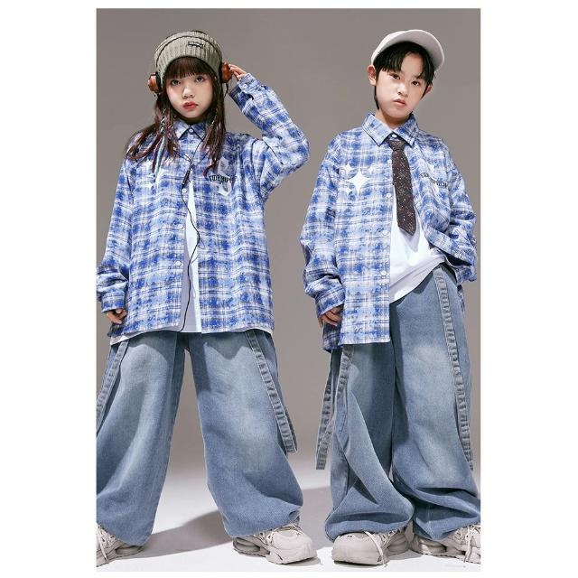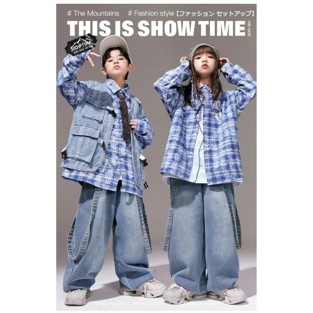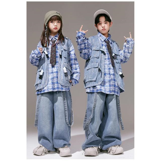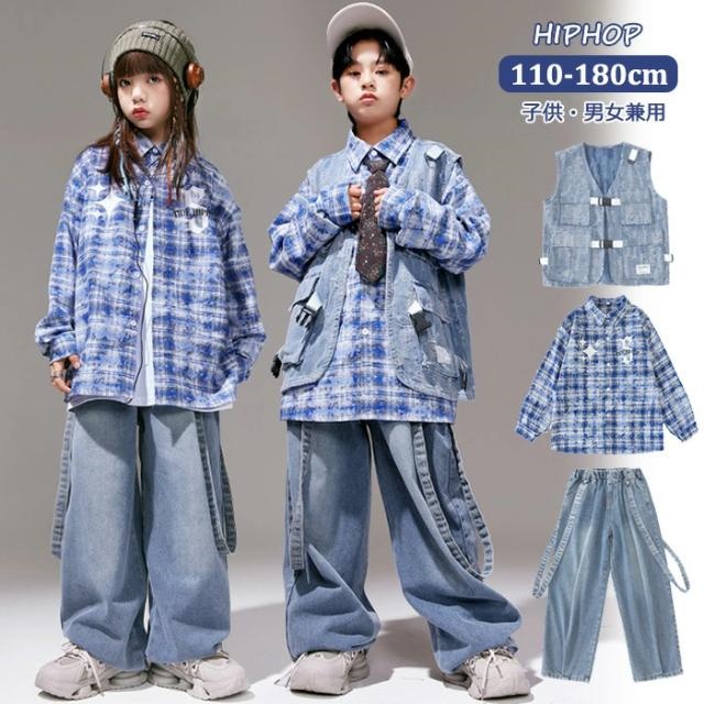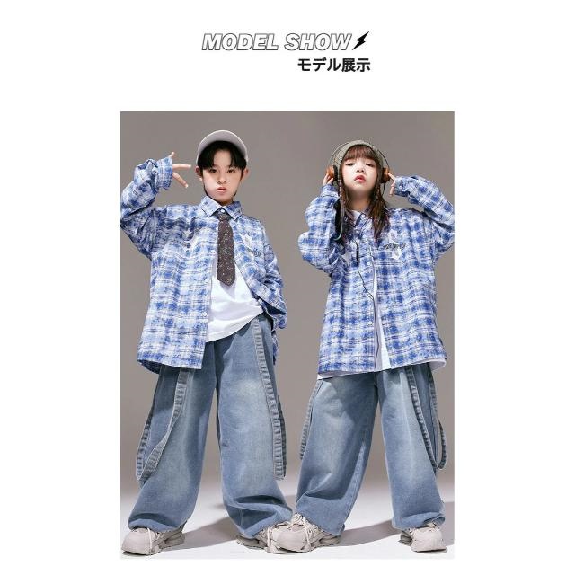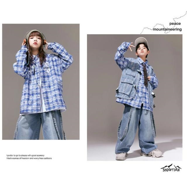 キッズ ダンス衣装 セットアップ ヒップホップ ジャージ ベスト ブルー チェック柄 長袖 tシャツ チェック柄シャツ ストリート系 オシャレ ジーパン デニムパンツ 女の子 男の子 ジャッズ 単品 ダンス衣装 派手 団体服 発表会 練習着 演出服送料無料