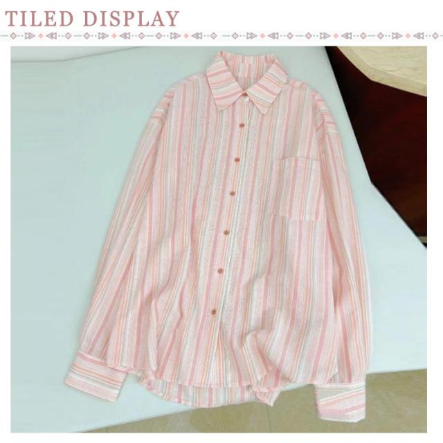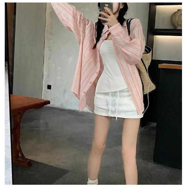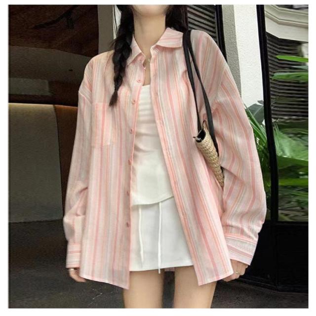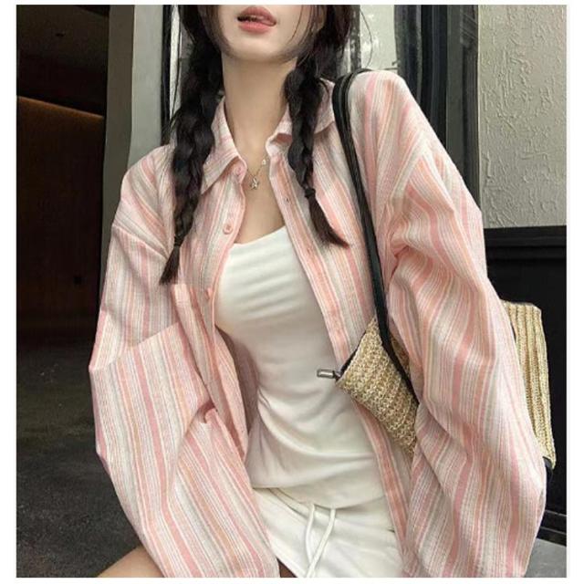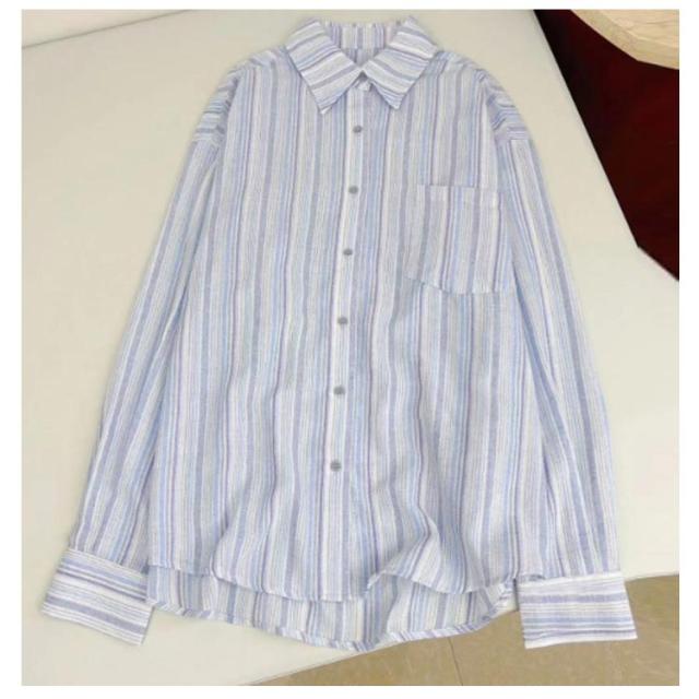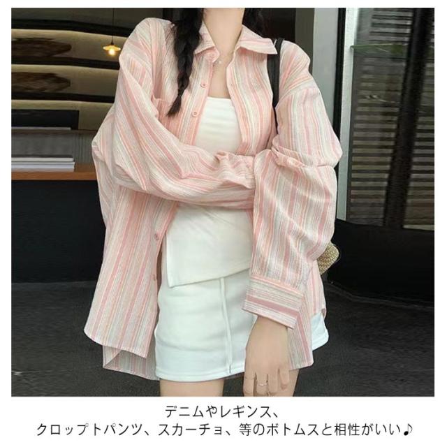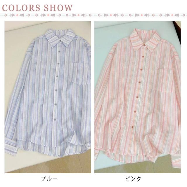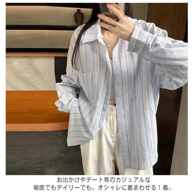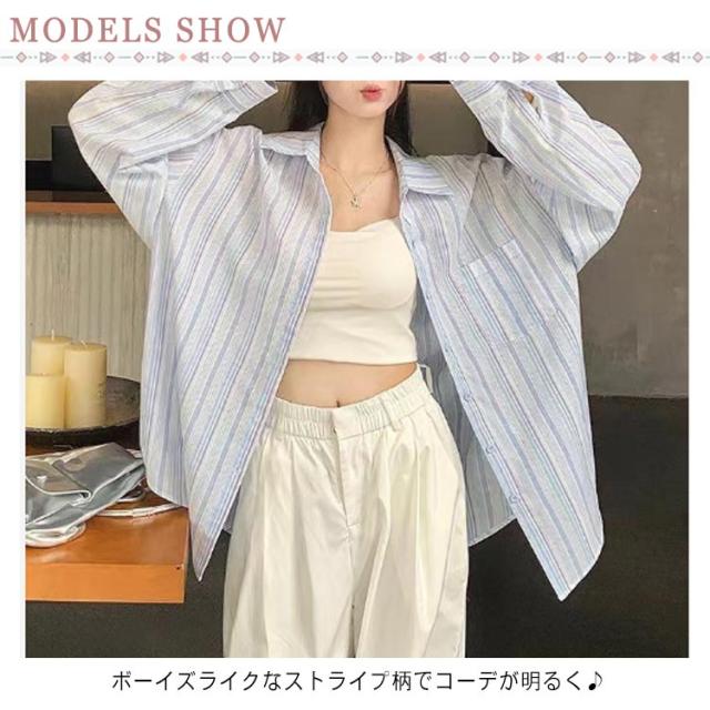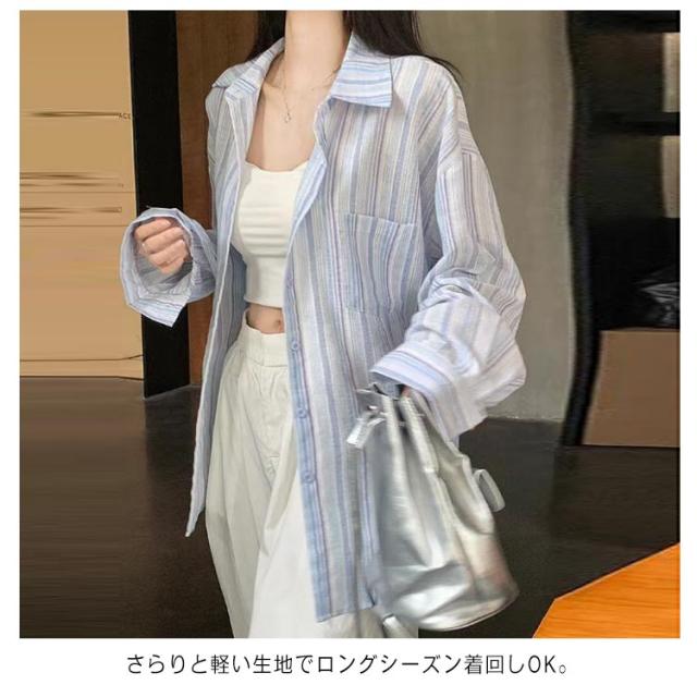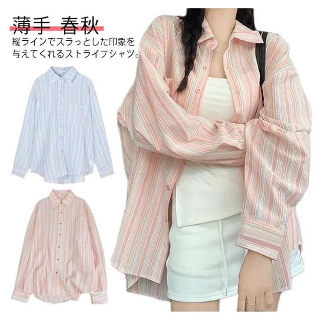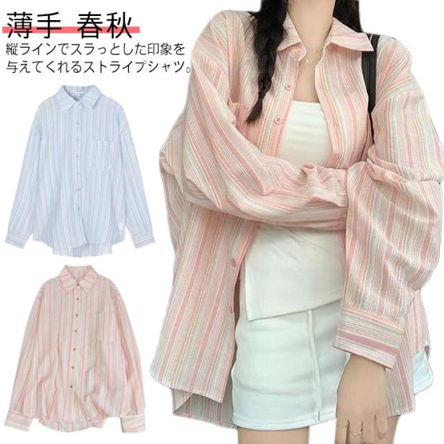 ストライプシャツ レディース 長袖シャツ キレイめ ロンT 透け感 薄手 ゆったり チュニック 羽織 カジュアル OL 通勤 オフィス 着回し 重ね着 通学 おしゃれ 夏 春秋 ブルー ピンク