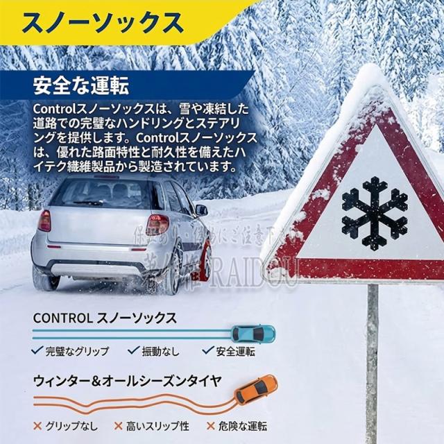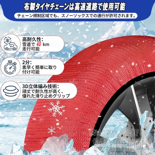 耐久性に優れたポリエステルメッシュ生地を使用した布チェーンのタイヤカバーは、雪道での安全性を向上します。軽量かつ簡単に取り付け可能で、使用しない時はコンパクトに保管ができるのがメリットです。<商品内容>・布チェーン タイヤカバー 2枚・装着時に衣類汚れ防止用のビニール手袋(腕まであるロングサイズ)左右※専用袋は付属しておりませんので、保存袋は簡易な袋等に入れて保管下さい。素材:ポリエステルメッシュ生地耐摩耗性と耐裂性に優れた生地は、特殊なノット織り技術を採用しているため、穴が開いても破れません。メッシュ生地は通気性に優れ、 空気が自由に循環し、使用中に氷や雪が 生地に付着するのを防ぎます。弾性ゴムバンドで伸縮性のあるバンドと柔らかいメッシュ生地を組み合わせることで、タイヤへのフィット感が向上し、運転がより安全になります。<取り付け位置>・FF車(前輪駆動車)は前輪の左右に装着・FR車(後輪駆動車)は後輪の左右に装着・4WDの場合は駆動力配分の多い方に装着(FFベースであれば前輪、FRベースであれば後輪)(4WDは自動車の取り扱い説明書に従ってください)