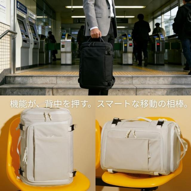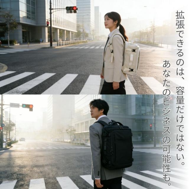 【拡張式収納】 日常の通勤から出張まで、一つのバッグで対応できる柔軟性。必要な時だけ容量を増やせます。