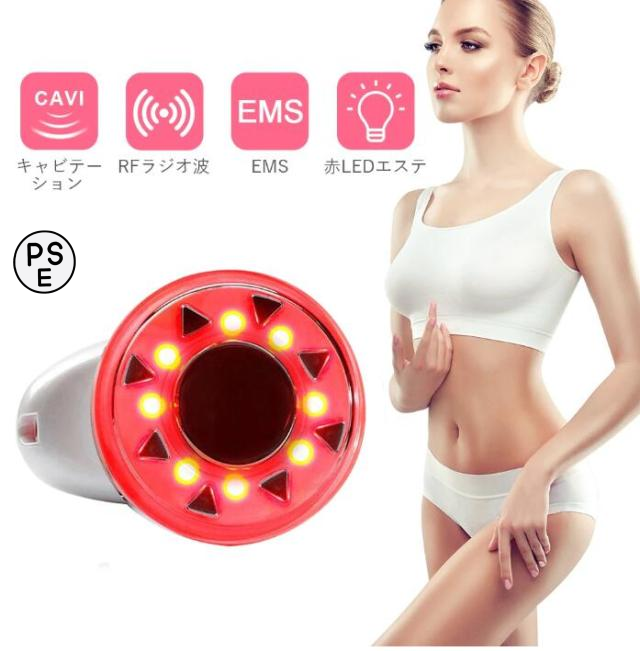 搭載機能:キャビテーション、RF温熱、振動エステ、赤LEDエステ、EMS