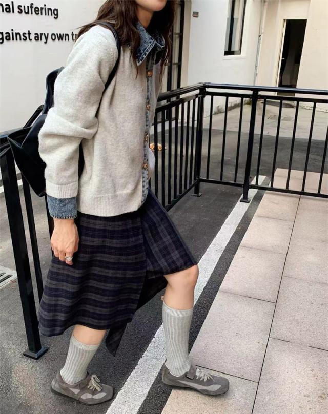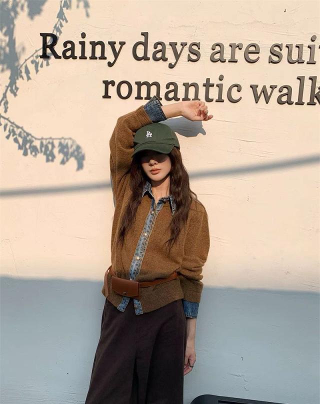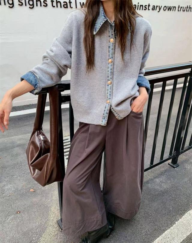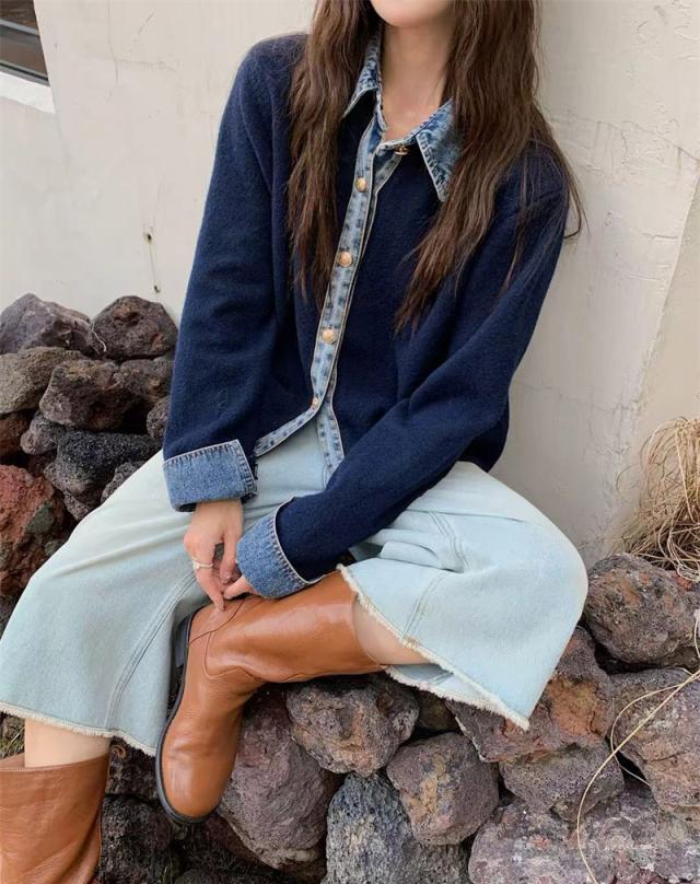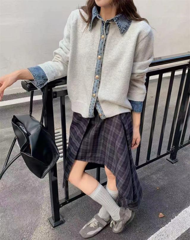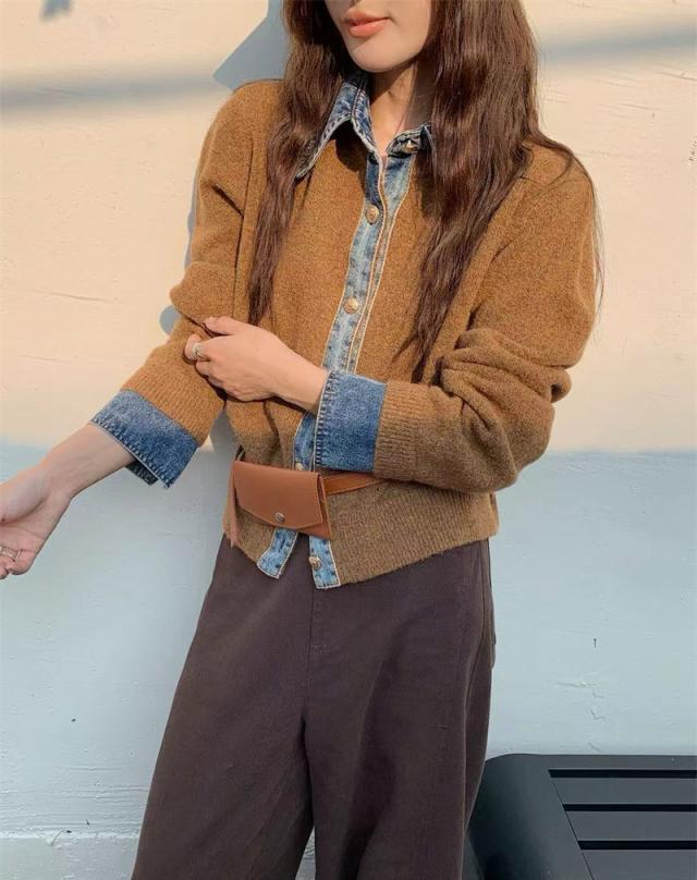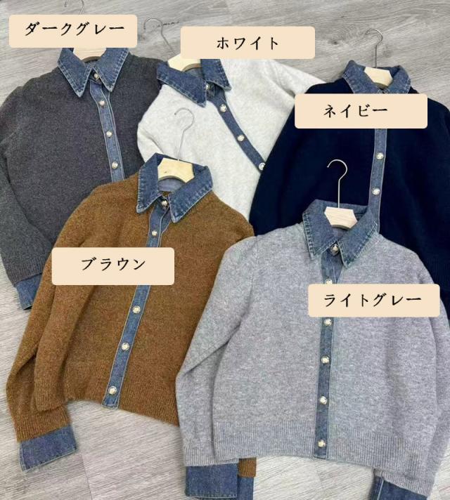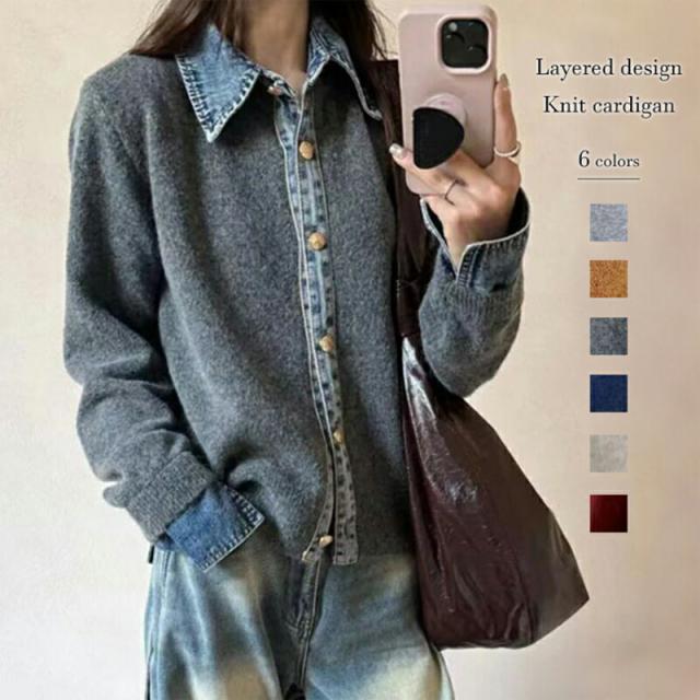 ニットカーディガン レディース 秋冬 レイヤード風 カーディガン ニットトップス デニム ニットカーデ 羽織り ジャケット 長袖 前開き アウター カーデ デニム切り替え 配色 カジュアル 金ボタン