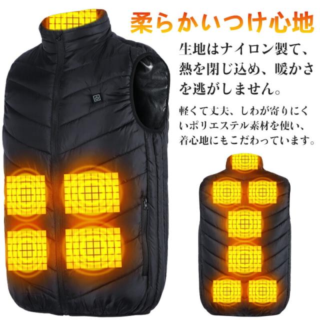 【前後11箇所発熱 防寒あったかベスト】前面に4つ、背面に7つの加熱ヒーターが内蔵され、しっかり温めてくれる発熱ベスト。男女兼用で、11箇所を効率よく温まるので、冷えやすい寒い季節の充電式暖房ベストとして保温できる電熱ベストです。通勤通学など普段使いはもちろん、スキー、スノボ、スケートなどのウィンタースポーツ、遊園地やスポーツ観戦、コンサートなどの屋外イベント、登山、釣り、キャンプ、自転車旅行などのアウトドア活動...様々なシーンで大活躍、寒さに負けず、冬を思う存分楽しむことができる防寒ウェア。