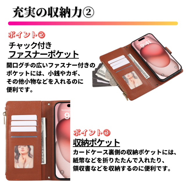 カードポケットx4 収納ポケットx1 ファスナーポケットx1の充実の収納力