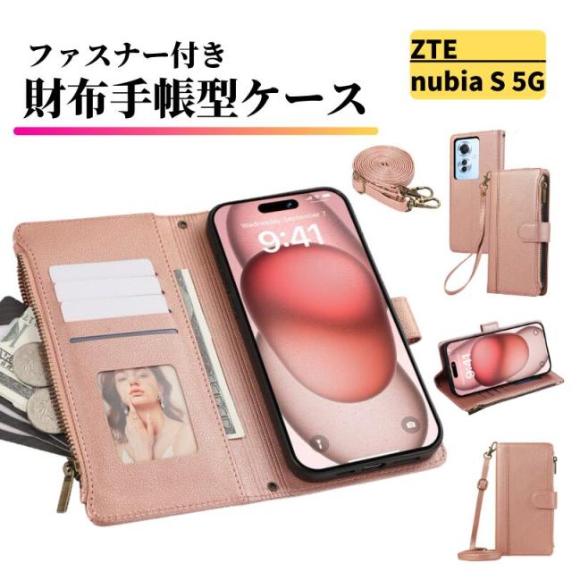 nubia S 5G ケース 手帳型 レザー お財布 ショルダー カードケース 軽量 カード収納 ストラップ 2種付 耐衝撃 スマホケース カバー 男女兼用 ZTE A403ZT ピンク