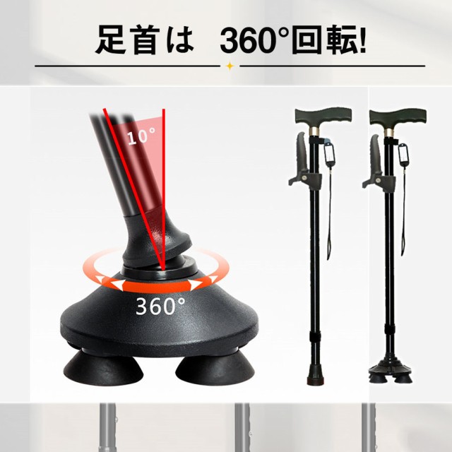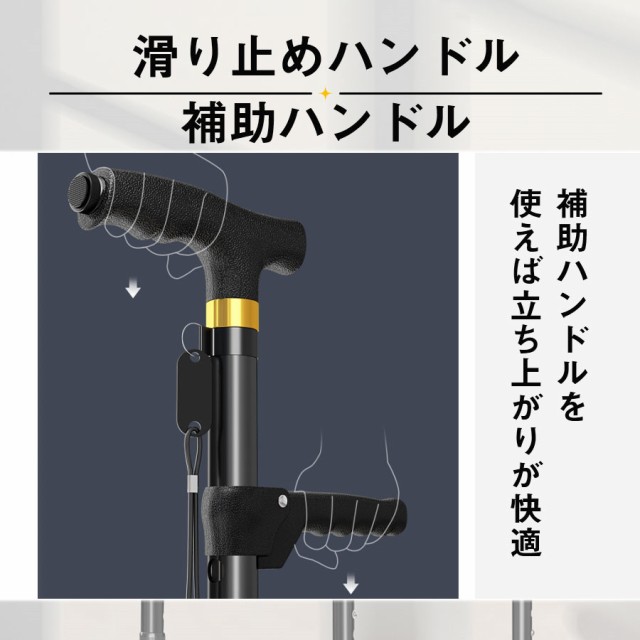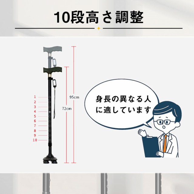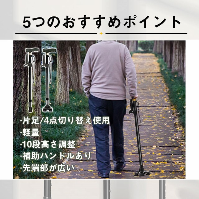 【ポイント5倍!】即納 杖 ステッキ 軽量 10段階調整 伸縮式 4点杖 滑り止め 歩行補助 介護 自立式 コンパクト 補助ハンドル付き 敬老の日 母の日 倒れない