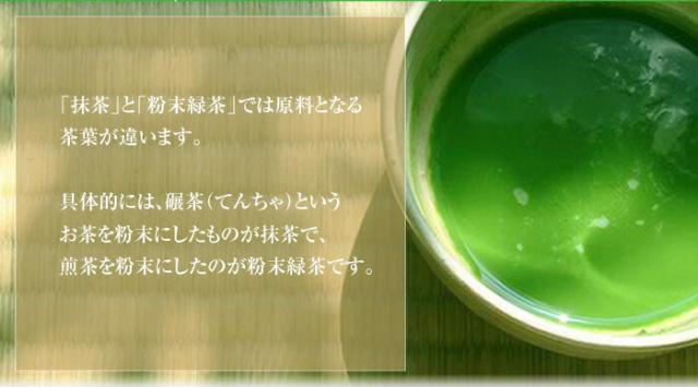 「抹茶」と「粉末緑茶」では原料となる茶葉が違います。具体的には碾茶(てんちゃ)というお茶を粉末にしたものが抹茶で、煎茶を粉末にしたものが粉末緑茶です。