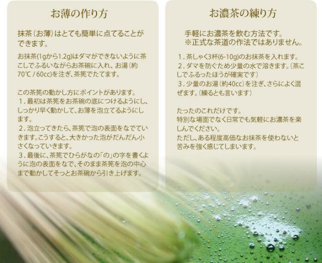 | 使用方法 | お茶、ケーキ、お菓子作りなど、様々な用途で扱えます。 少量でも抹茶の風味・香りが強いので、少しづつ使用することをおススメします。 |