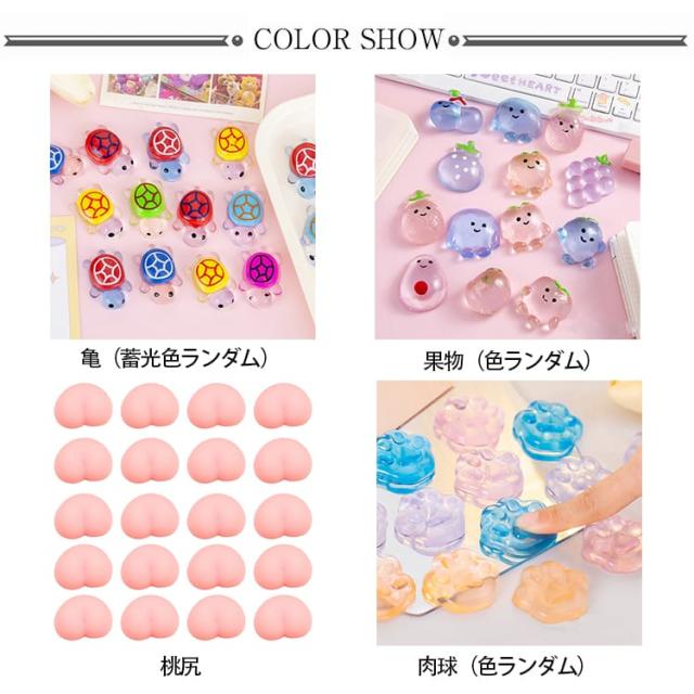 | もちもち触感の癒しパーツで、手帳もスマホも推し活デコももっと可愛く。 20点セット ぷにぷにのお尻、もちもち肉球、蓄光タイプのかわいいカメ、さらにはフルーツモチーフまで人気のスクイーズ触感パーツが大集合! やわらかいTPR樹脂を使用しているため、指で押すと心地よいぷにぷにもちもち感触が楽しめます。仕事や勉強の合間のちょっとしたリラックスタイムに、思わず夢中になる癒し効果で、心と指先のストレスを優しく解放。 好きなや台紙に貼って、オリジナル立体デコが作れるDIYアイテム。 ぷっくり可愛い3D立体で、押すとやみつきになる柔らかさ。 立体3Dで貼るだけで存在感バツグン、スマホケースのワンポイントデコに最適。 の上に貼って立体カスタム。子供のデコ遊びにも、大人の癒しグッズにも、人気上昇中のぷにぷに・もちもちの柔らか触感のデコパーツです。 ※ご注意:本商品は「ぷにぷにパーツ本体のみ」です。は付属しませんので、お手持ちの帳やケースに貼ってお楽しみください。貼り付ける際はお手持ちの両面テープ等をご利用ください。 | |