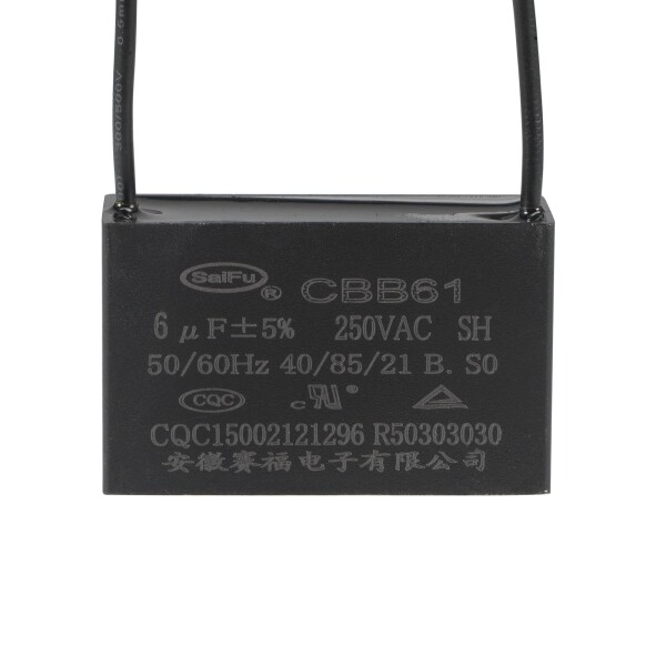パッケージ - CBB61コンデンサ1個入、2ワイヤ、電圧250V AC, 定格電位6uF (±5%), 頻度 50/60Hz, 範囲40/85/21, ワイヤ長さ 120mm 、シェルサイズ: 47x29x18mm