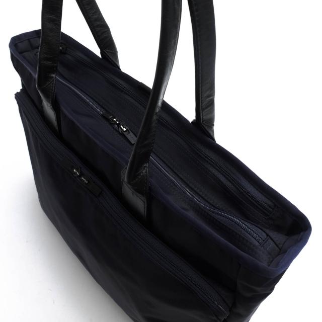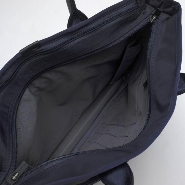 独特の素材感が魅力的なコーデュラナイロンに革を贅沢に組み合わせ、現代的なルックスに仕上げられている点がポイント。また、メイン素材に引裂き、摩擦強度に優れるコーデュラナイロンを用いることで、強度を高めると共に軽量性も実現しています。A4サイズが余裕で入るサイズ仕様のビジネストートモデル。多機能な内装には大きなジップポケットや仕切りポケット、ペンホルダー、ボトルホルダーなどが備えられ、ビジネスツールやペットボトル、折り畳み傘などが整然と収まります。背面のトロリーバー通しにより、トロリーバッグとのセットアップも可能です。