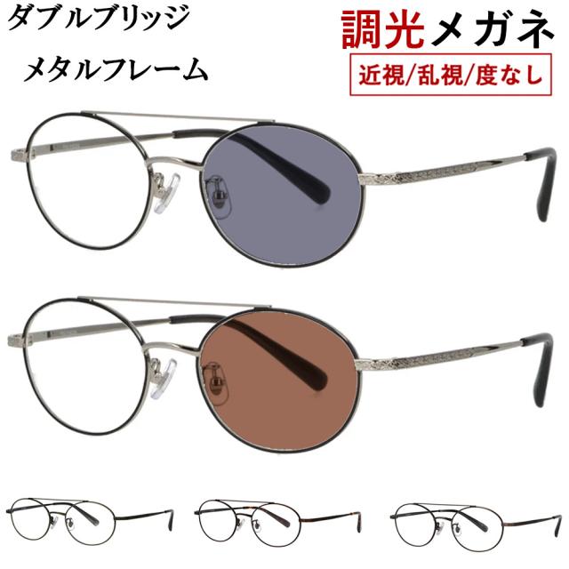 調光メガネ 度付き 度なし 調光サングラス メンズ レディース オーバル ダブルブリッジ メタルフレーム 鼻パッド付き YM-19024 UVカット 近視 乱視 だて 伊達 紫外線カット クリア グレー調光 ブラウン調光 レトロ クラシック