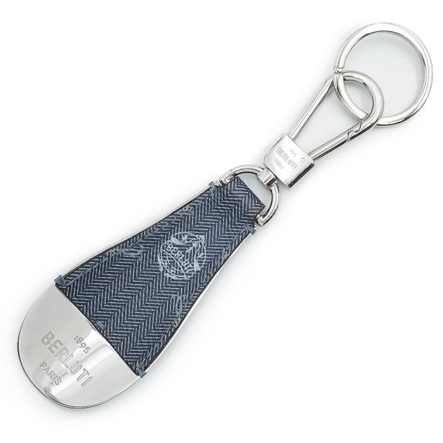 (中古)Berluti ベルルッティ シューホーン 靴べら キーリング キーホルダー バッグチャーム シグネチャーキャンバス ブルー シルバー金具
