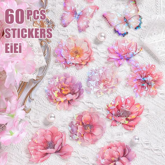 EiEi クリアシール 60枚 貝シェル光加工 大容量 コラージュ素材 おしゃれ ローズ 薔薇 花びら 向日葵 菊 蝶 バタフライ すれみ イラストシール 透明シール 半透明シール PETシール 耐水 防水シール 白 紫色 青色 花柄 素材 手芸 手帳 日記 DIY sztz-60-089