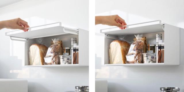 扉を開けるときは持ち上げてから押し込む構造です。開けたままで固定もできるので、使ってから戻すまでの動作もラクに行えます。