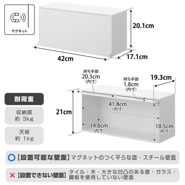 | サイズ | 約 幅42×奥行17.1×高さ20.1(cm) 扉開口時:約 奥行19.3×高さ21(cm) 収納部:約 幅41.8×奥行14.6×高さ18.5(cm) (有効内寸・ローラー部含まず) |