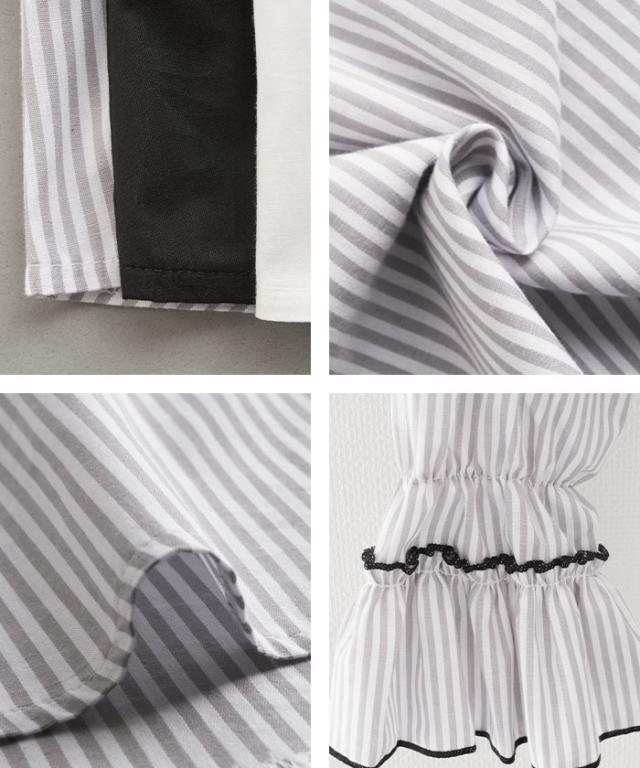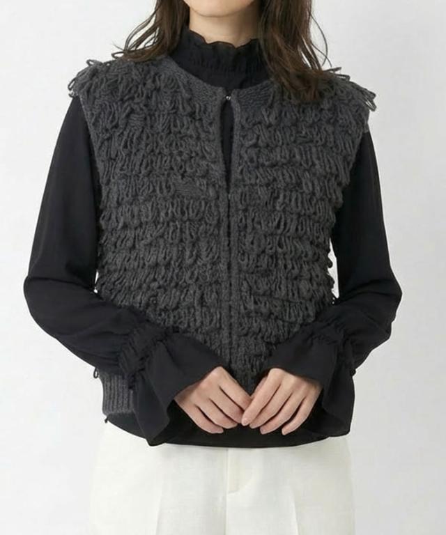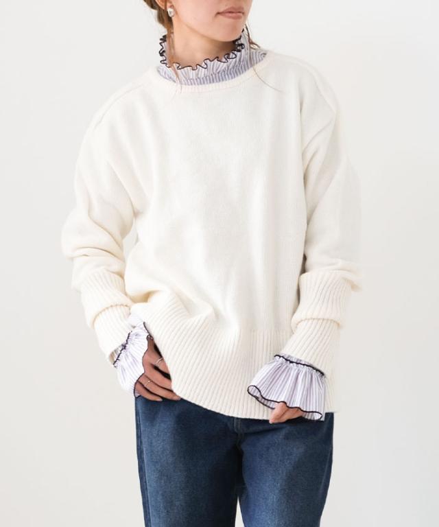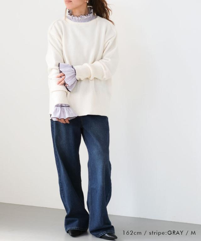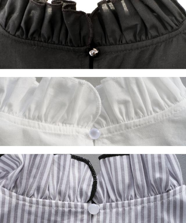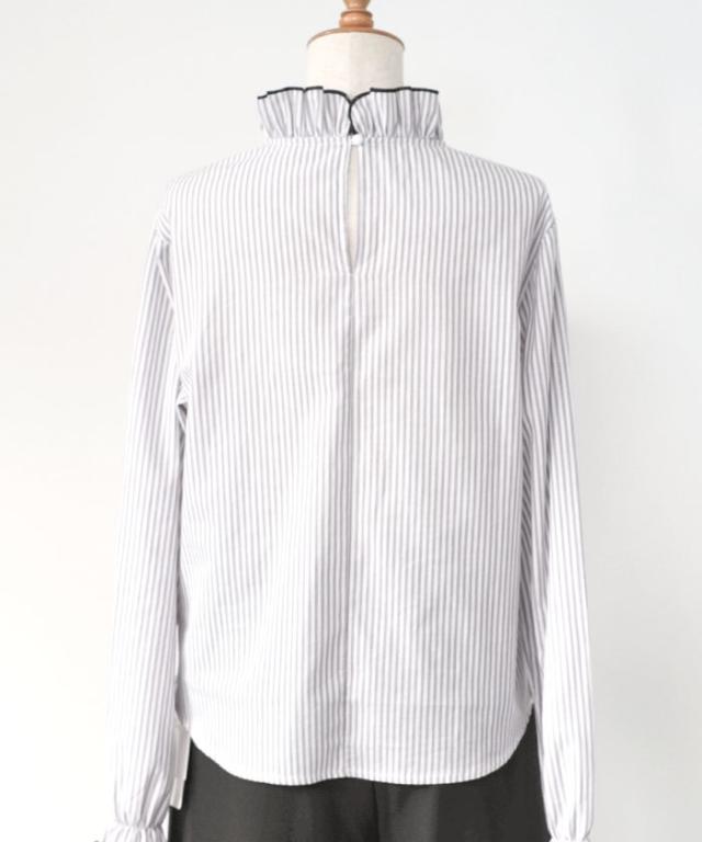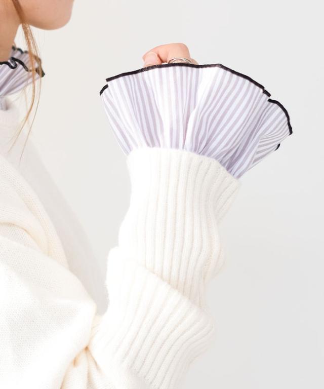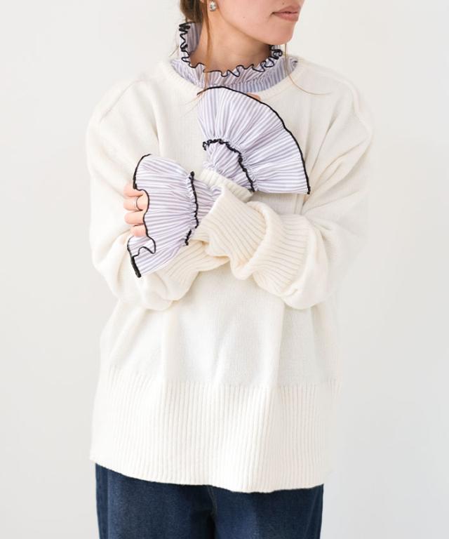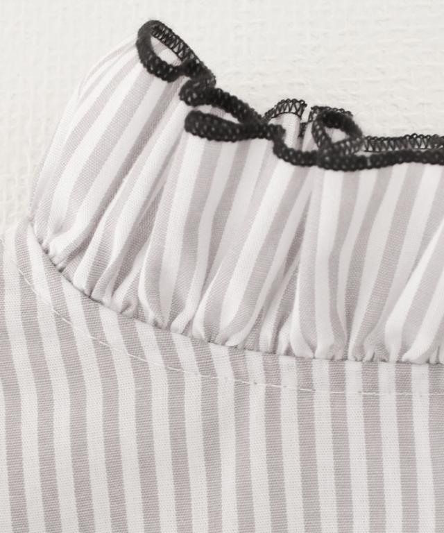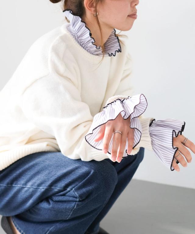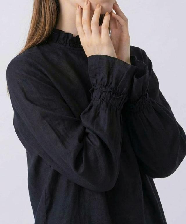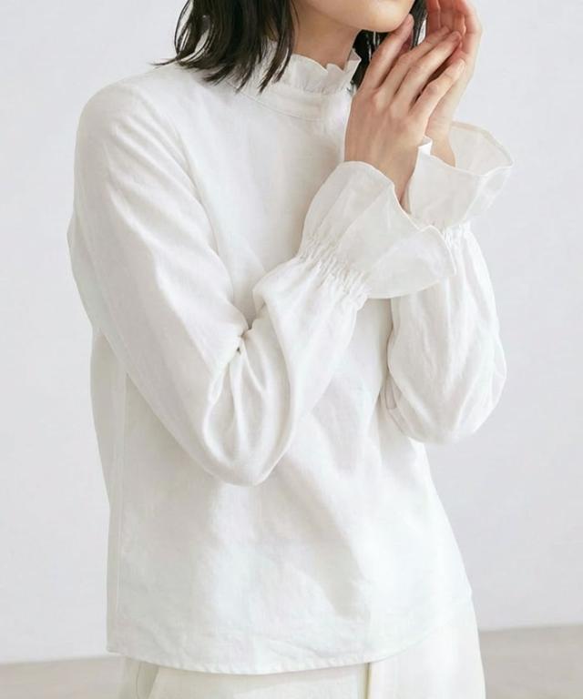 襟元や袖にあしらわれたフリルは主張しすぎず、動くたびに柔らかく揺れる上品な仕上がり。