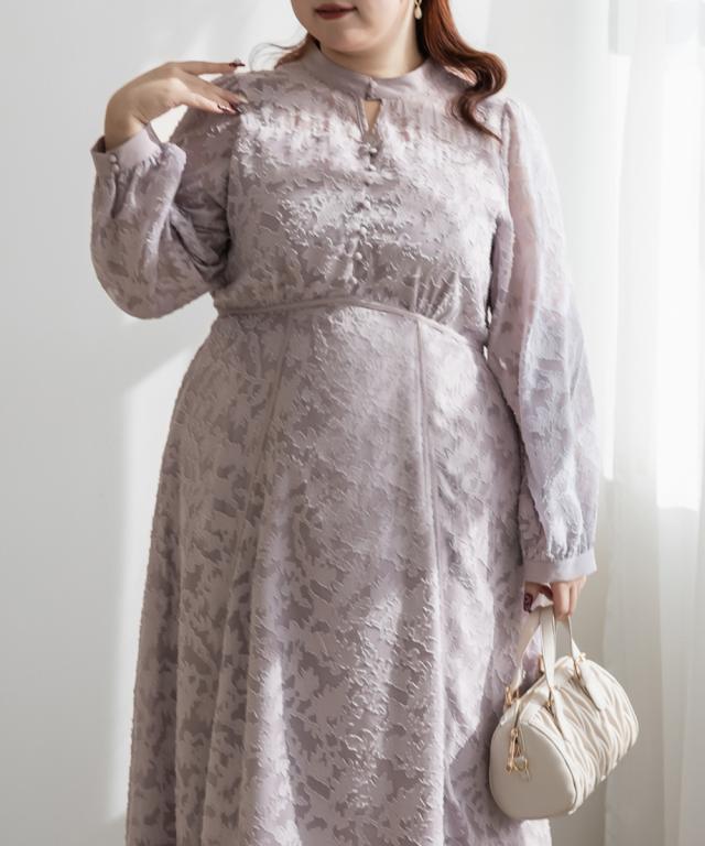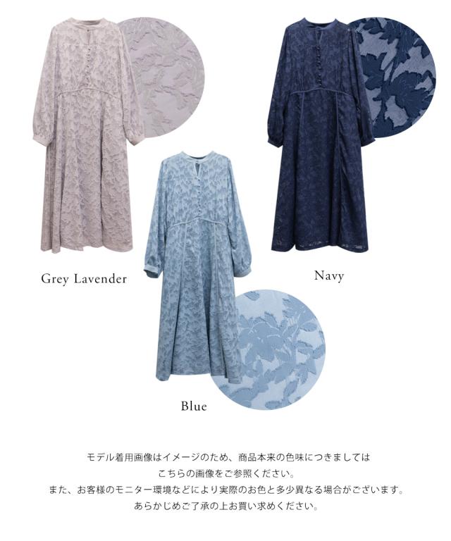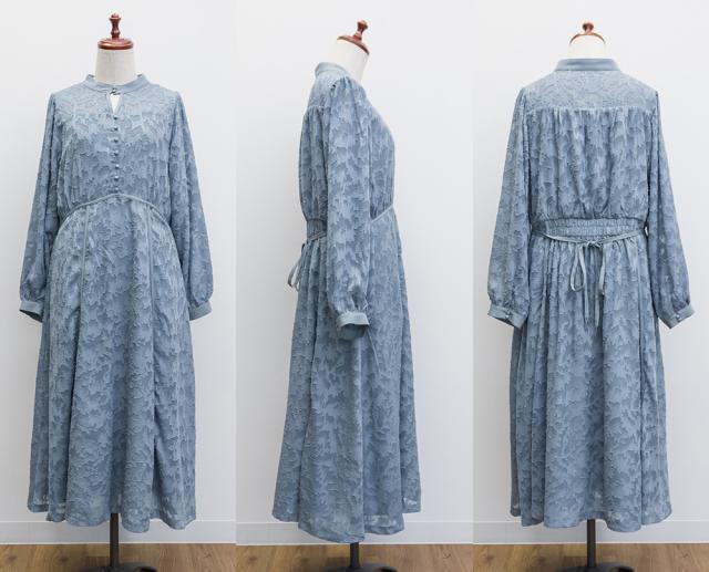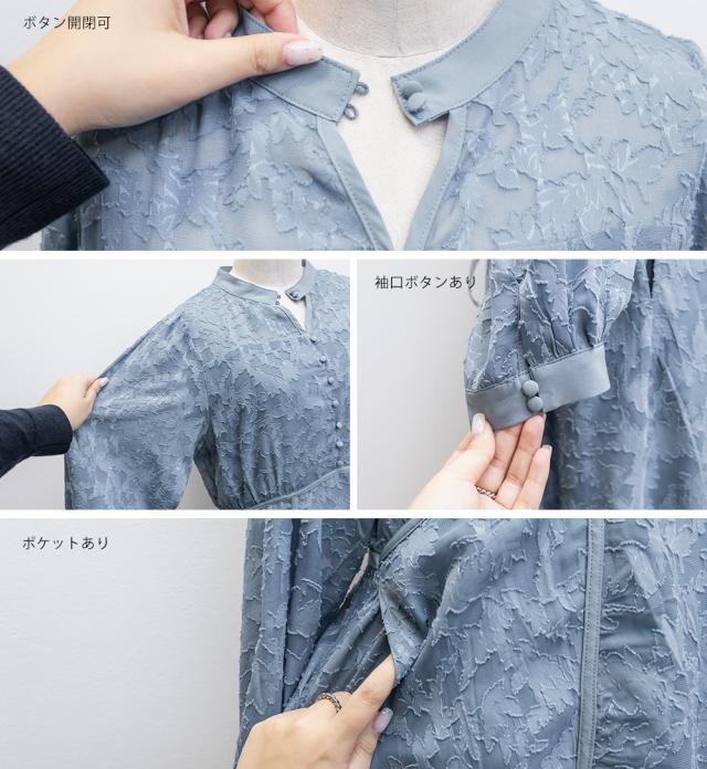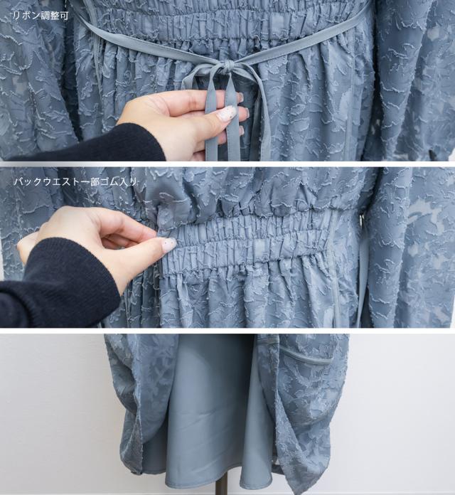 | 透け感のあるジャガード織のような表地生地。透けている部分と柄の部分で違った表面感のある上品な素材です。身頃部分は伸縮性のないさらりとした肌触りの裏地付きです。(デコルテ&袖は裏地無し) |