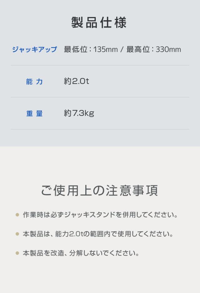 | 内容 | フロアジャッキ 2t 本体 ×1 |