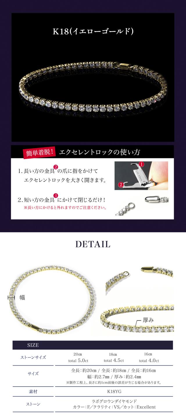 《商品詳細》 天然ダイヤモンド・ラボグロウンダイヤモンド・モアサナイトの違いとは? ストーンサイズ total 5.0ct / total 4.5ct / total 4.0ct(F-VS-EX) サイズ 全長:約20cm / 約18cm / 約16cm 幅:約2.7mm/厚み:約2.4mm ストーン ダイヤモンド ラボ・グロウン・ ダイヤモンドは最新テクノロジーが生み出した合成ダイヤモンドです。 地金素材 K18(イエローゴールド) 付属品 ジュエリーBOX 品質保証書