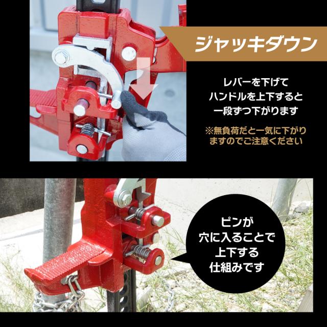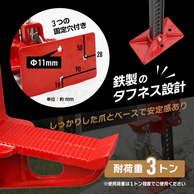スタック時のリフトアップ・現場作業・ウインチ用途に! 車のメンテナンス、アウトドアなどで大活躍 ●ウインチ用途ではシャックルなどを通せる穴が開いており、横引きで使用可能です ●油圧を使わないシンプルな構造で、誰でも簡単に操作しやすい設計です ●頑丈で耐久性に優れた鉄製で、しっかりした爪とベースで安定感があります ●ベースには3つの穴が開いており、固定することもできます ●移動時などにハンドルを固定できるハンドルキーパー付き ●試運転をしていただき、使い方を熟知した上で現場でお使い下さい ●実使用荷重1トン程度でご使用下さい ハイジャッキ用アクセサリー ・リフトメイト(HL-N) ・ベース ハイジャッキ用(HL-B) ・サンドリカバリー レッド 2枚セット ジャッキベース内蔵(SDR-238) 品番:HL-48 |