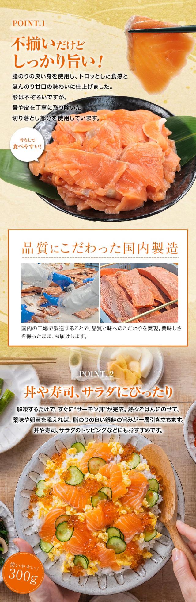 銀鮭 サーモン 切り落とし 300g 不揃い お刺身 生 生食可 鮭 スライス 丼 寿司 冷凍