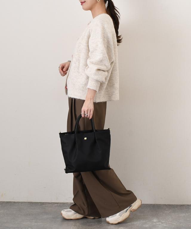 上品な光沢のあるナイロンに、手触りの良い柔らかい合皮を使い合わせたバッグ