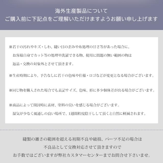 ■注意事項1:商品の開封時に素材の臭いを感じる場合がございます。湿気が少なく風通しの良い場所で、一週間程度陰干しして頂くと自然に軽減されます。