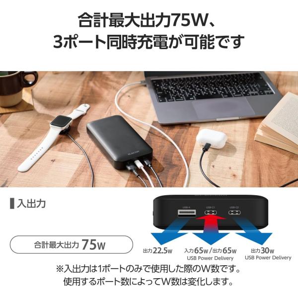 ● USB Type-Cポートを2ポート、USB-Aポートを1ポート搭載しており、合計最大75Wの出力が可能な高出力モデルです。