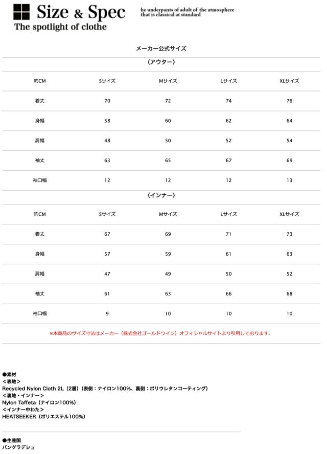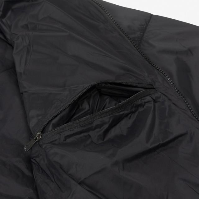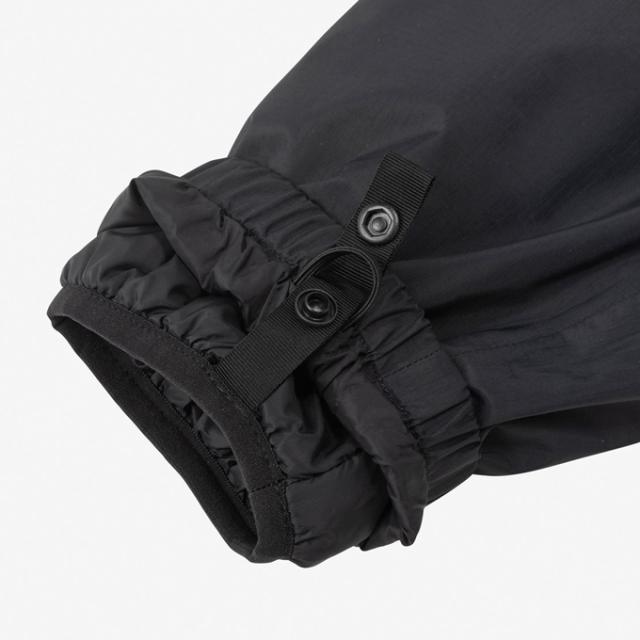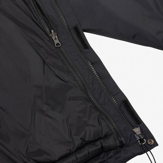インナージャケットとアウターはフロント内部のファスナーと袖口、首元のスナップボタンで連結して着用することも、それぞれを単体で使用することもできます。アウターは防水透湿性を持つ2層構造のナイロン素材を採用。インナーはしなやかなナイロンタフタ。軽量でかさ高がある、独自開発の中わた・HEATSEEKERで保温性を高めています。アウターのフードはワンハンドアジャスター対応です。 |