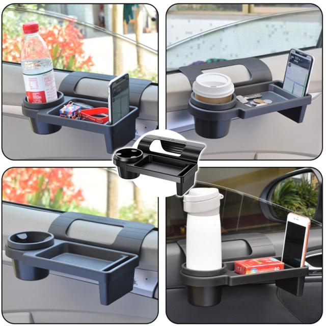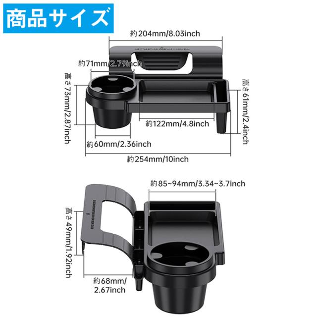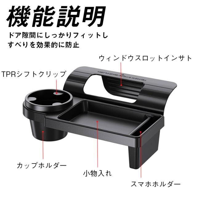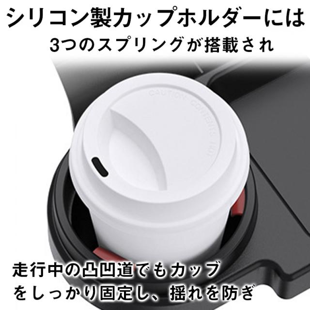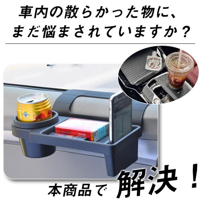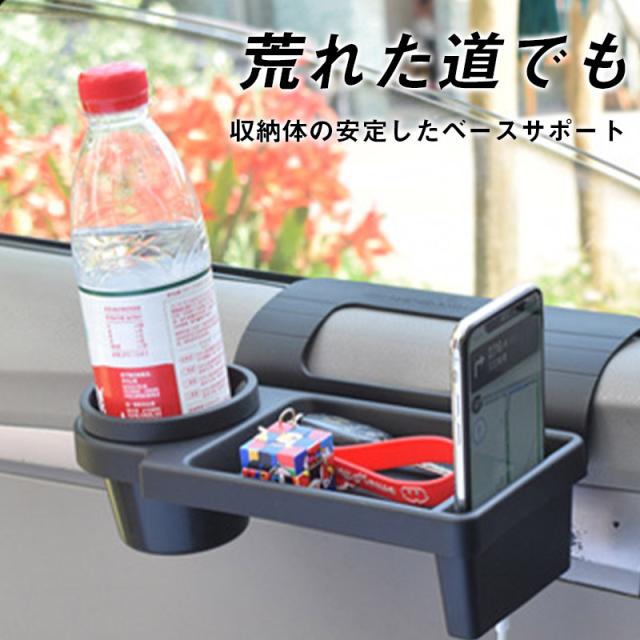 ドリンクホルダー・スマホホルダー・小物入れを一体化。鍵やイヤホンも整理でき、省スペースで便利。