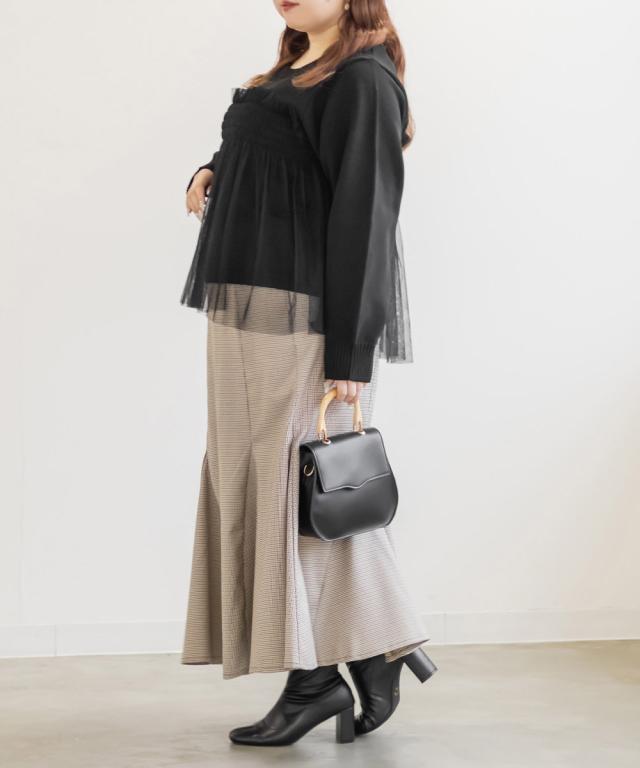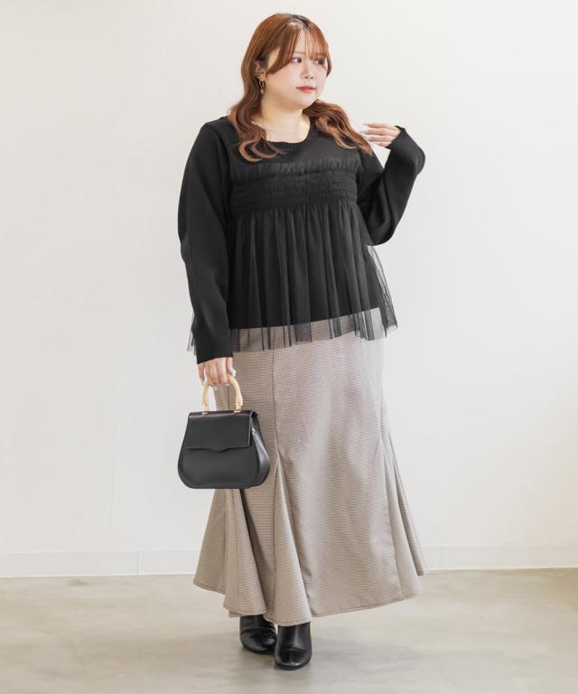 | 3Lを着てちょうどいいサイズでした。チュールのベアトップを着ているようなデザインで、重ね着が苦手な方でも悩まずにレイヤードスタイルになれる1枚です!伸縮性のあるニットで楽ちんな着心地です!二の腕やお腹・腰周りをカバーしてくれるデザインだから着やせもできちゃいます◎長すぎず短すぎない着丈だから、スカートにもパンツにもあわせやすいです♪ |