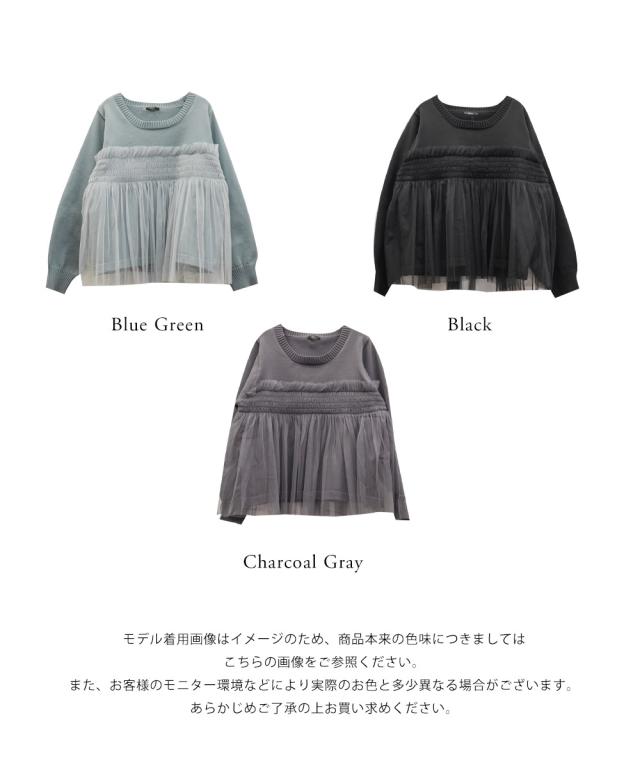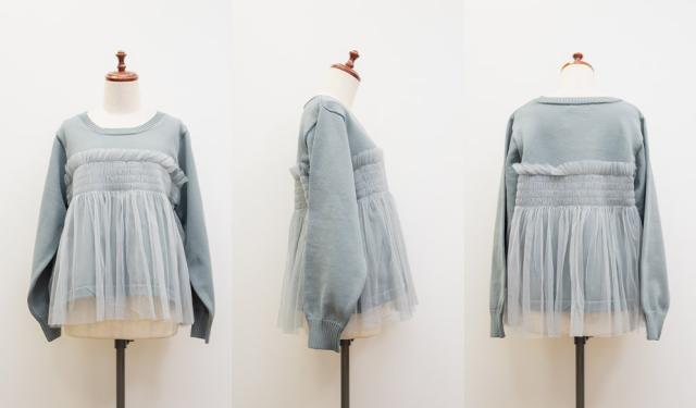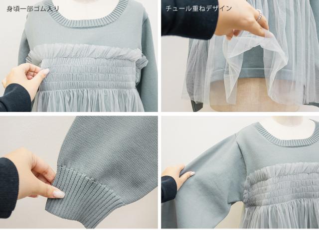 | 起毛感の少ないスポンジ風ニット素材。チュールはチクチク感の無い柔らかい素材。 |