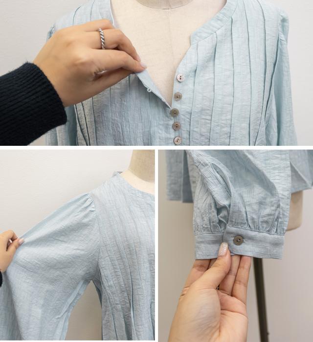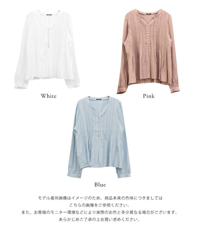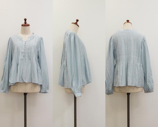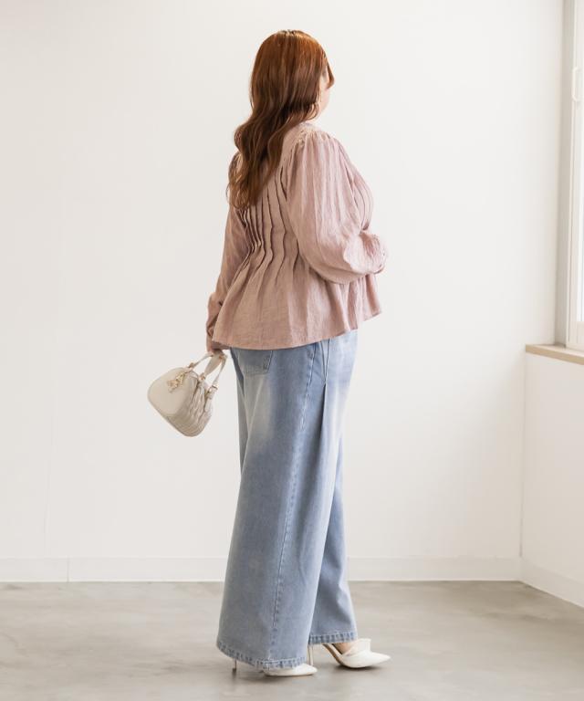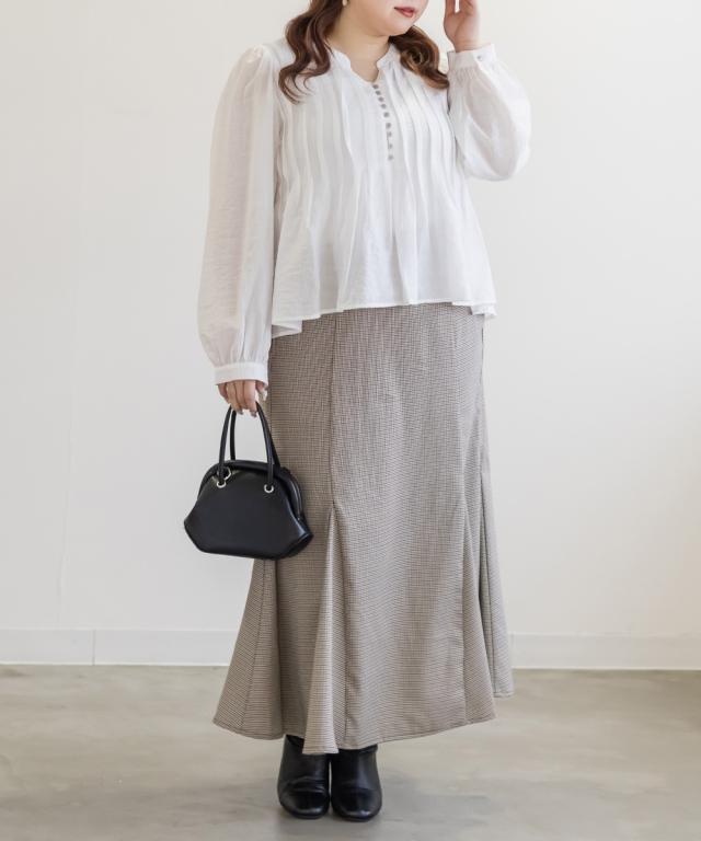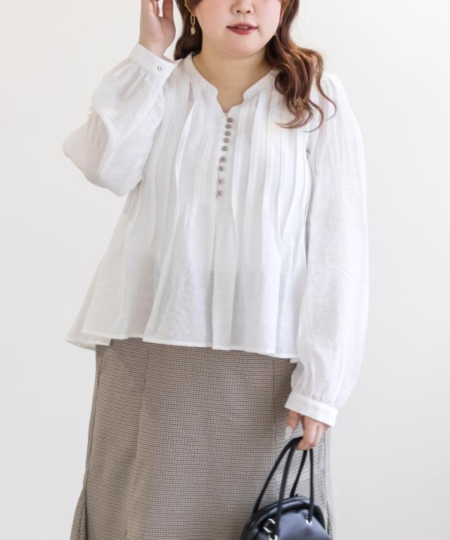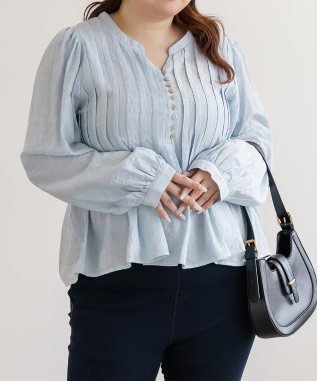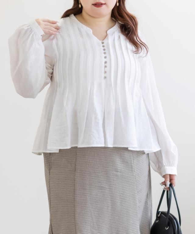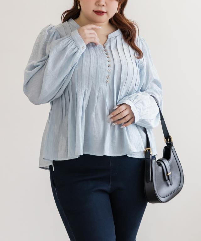 | 3Lサイズを着用しました。ウエスト・バストにゴムが無くタックでくびれてるように見えるすっきりとしたシルエットのブラウスです。伸縮性は無いので心配な方はサイズ確認をおすすめします◎ウエストラインまで入ったピンタックが縦ラインを強調してくれるので、自然とすっきり華奢見えするのが嬉しいです!お腹や腰まわりはしっかりカバーされていて安心感もあります。さらっとした軽い着心地で、ややシアーな素材感が女性らしい印象です。 短め丈なのでロングスカートやパンツと合わせるとバランスよく、デイリーからお仕事にもおすすめです♪ |