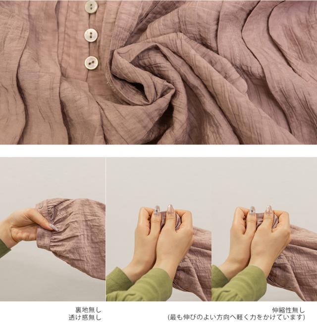 | クレープ調で表面感のある、少し透け感のある布帛素材。伸縮性のないさらりとした肌触りです。 |