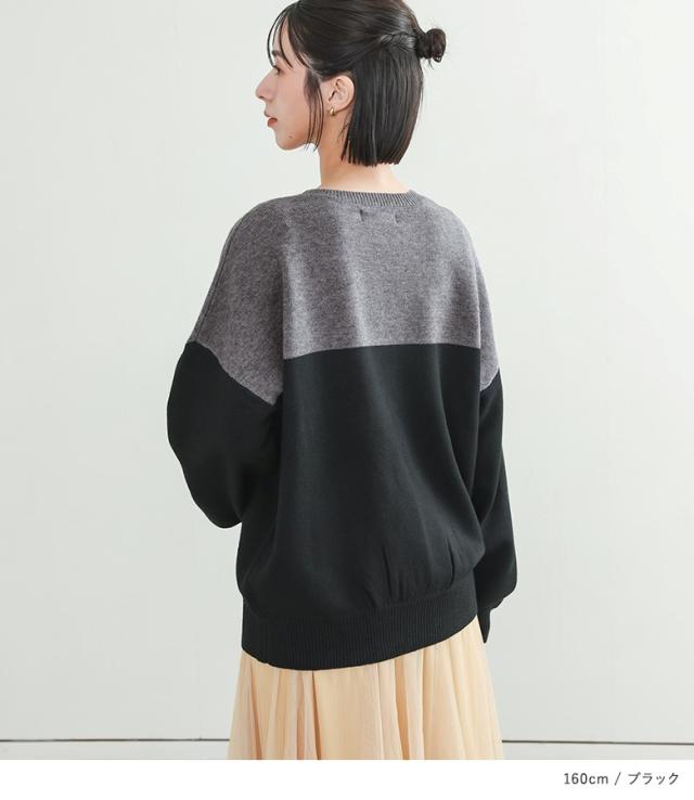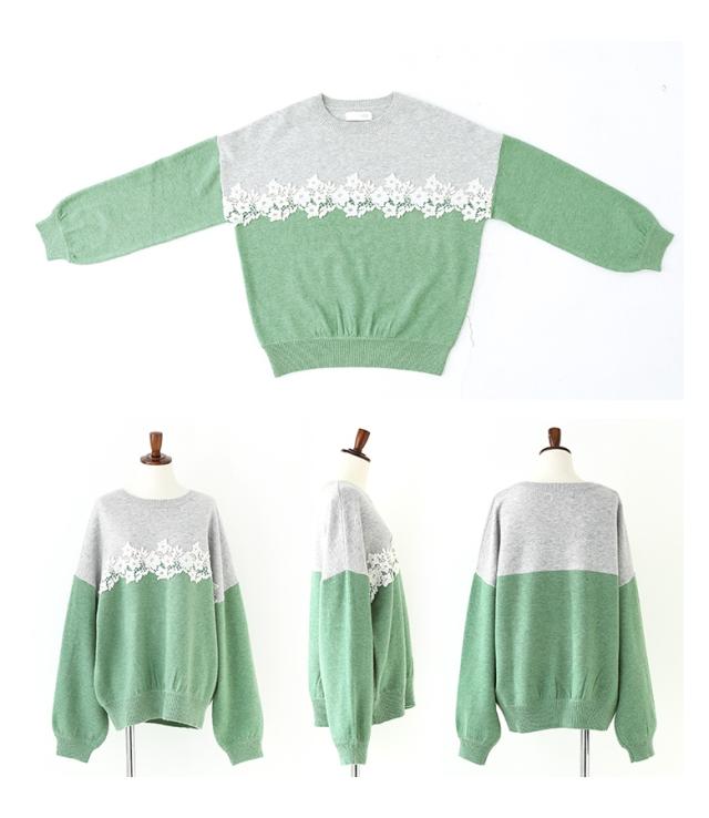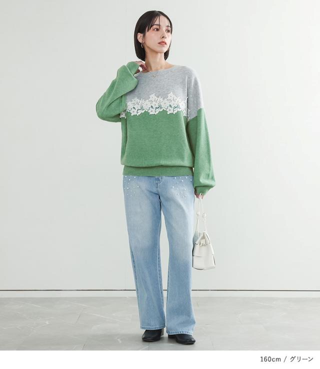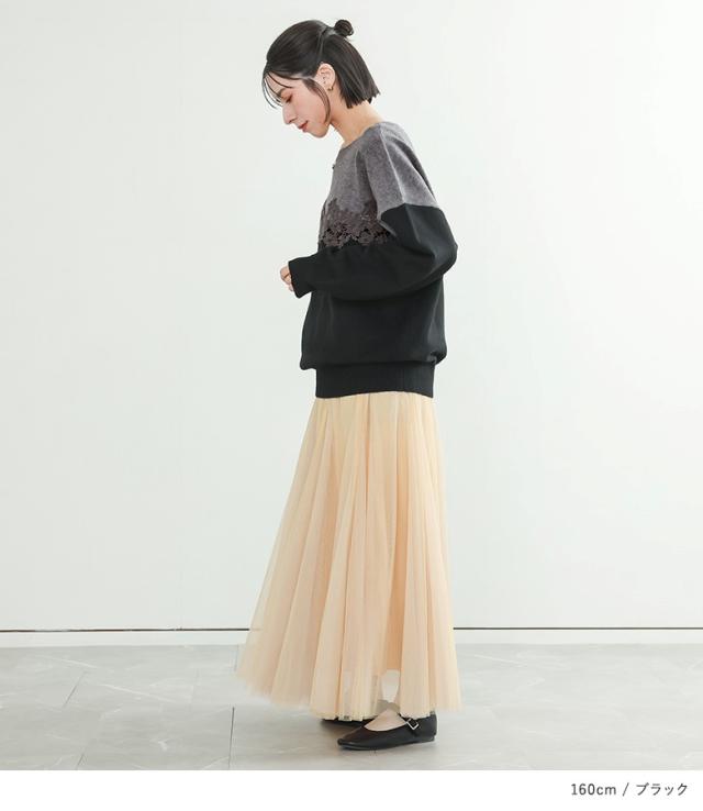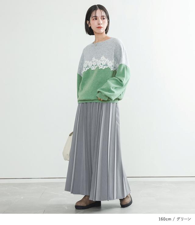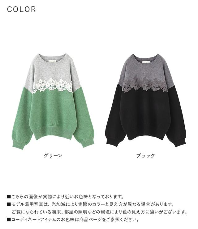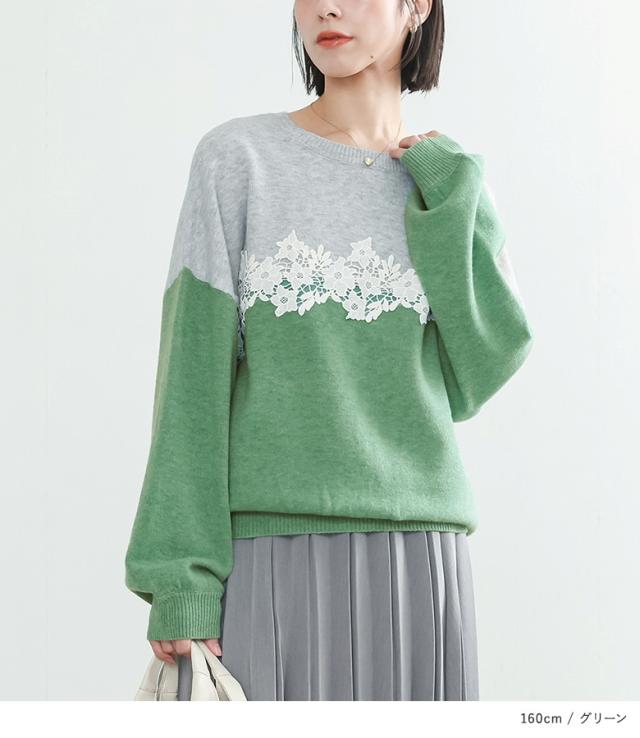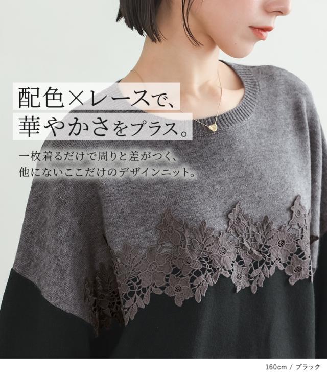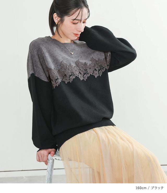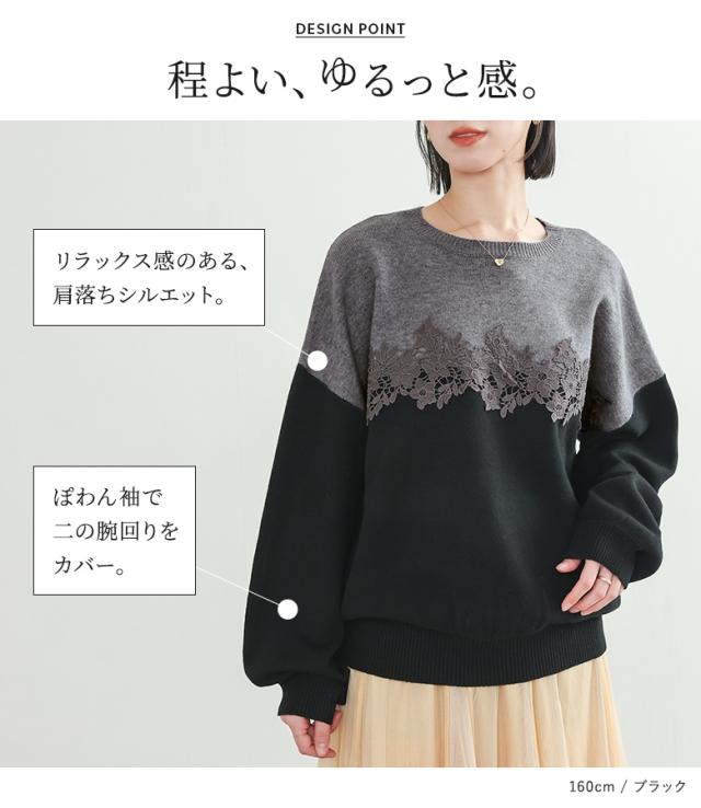 <冬新作>『レース付配色ニット』【メール便不可】【20】[ニット 長袖 レディース トップス セーター クルーネック レース 配色 パフスリーブ ぽわん袖 お尻が隠れる 体型カバー 着ぶくれしない 春 秋]